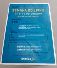 Com o objetivo de promover e incentivar a leitura, a Biblioteca Garcez da Uninter promove de 24 a 27 de outubro a Semana Nacional do Livro e da Biblioteca. Entre as opções programadas estão exposições, música ao vivo, contação de histórias, dobraduras, mandala, Jogo de RPG bem como oficina de restauração de livros.