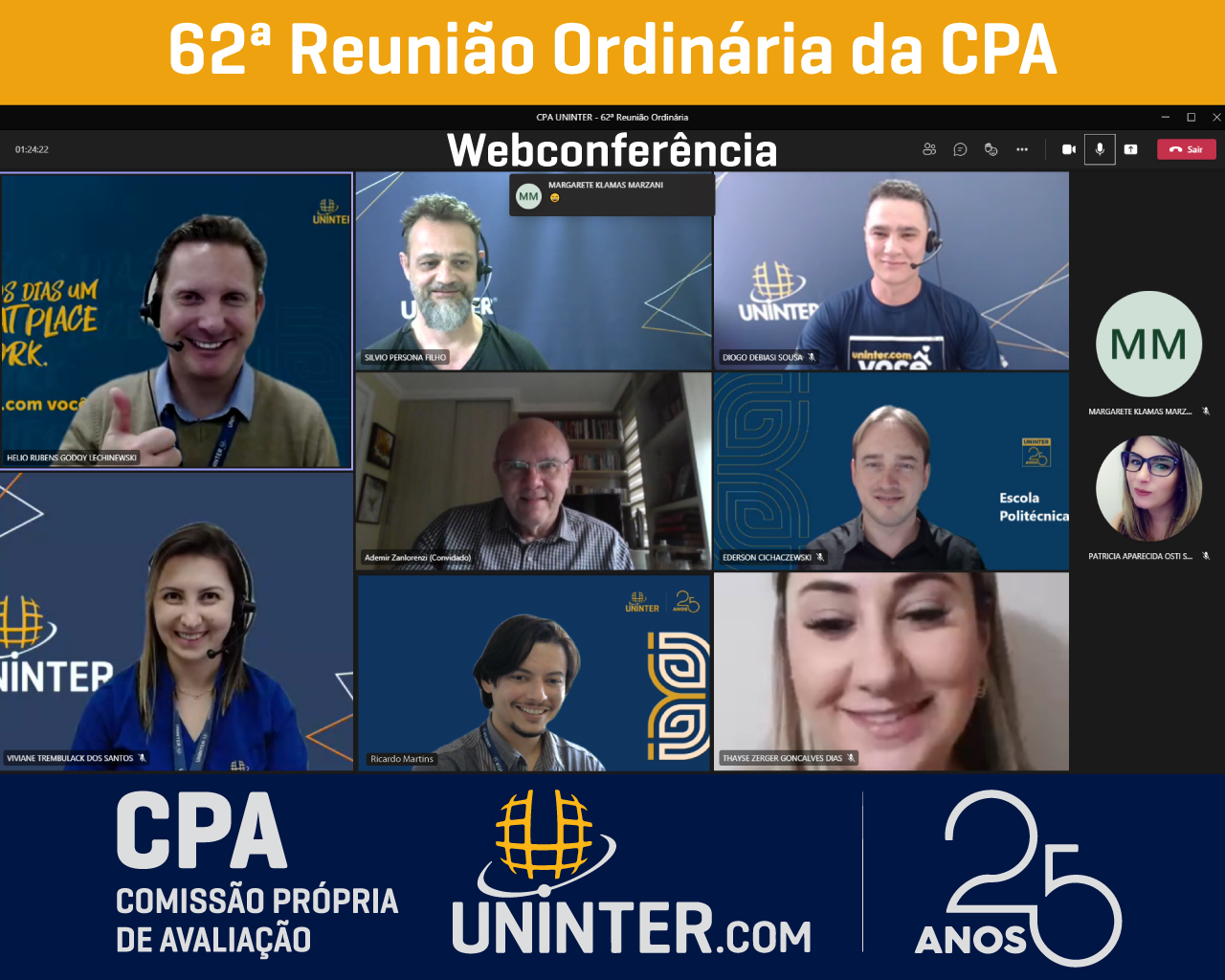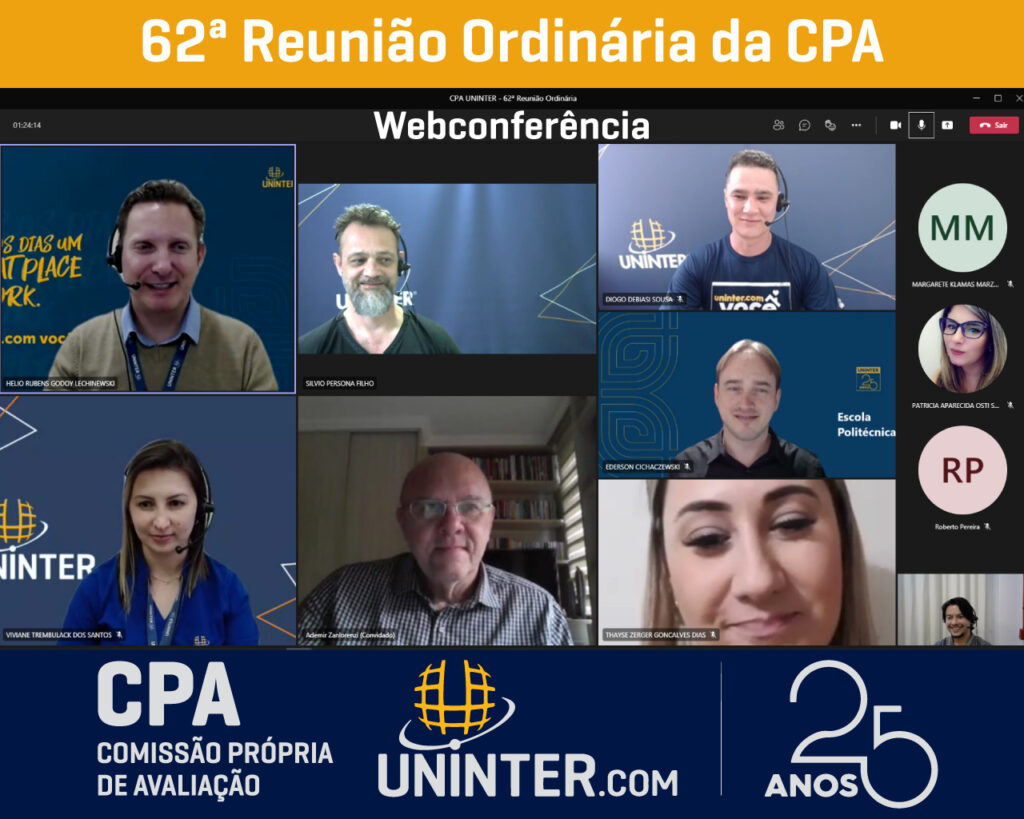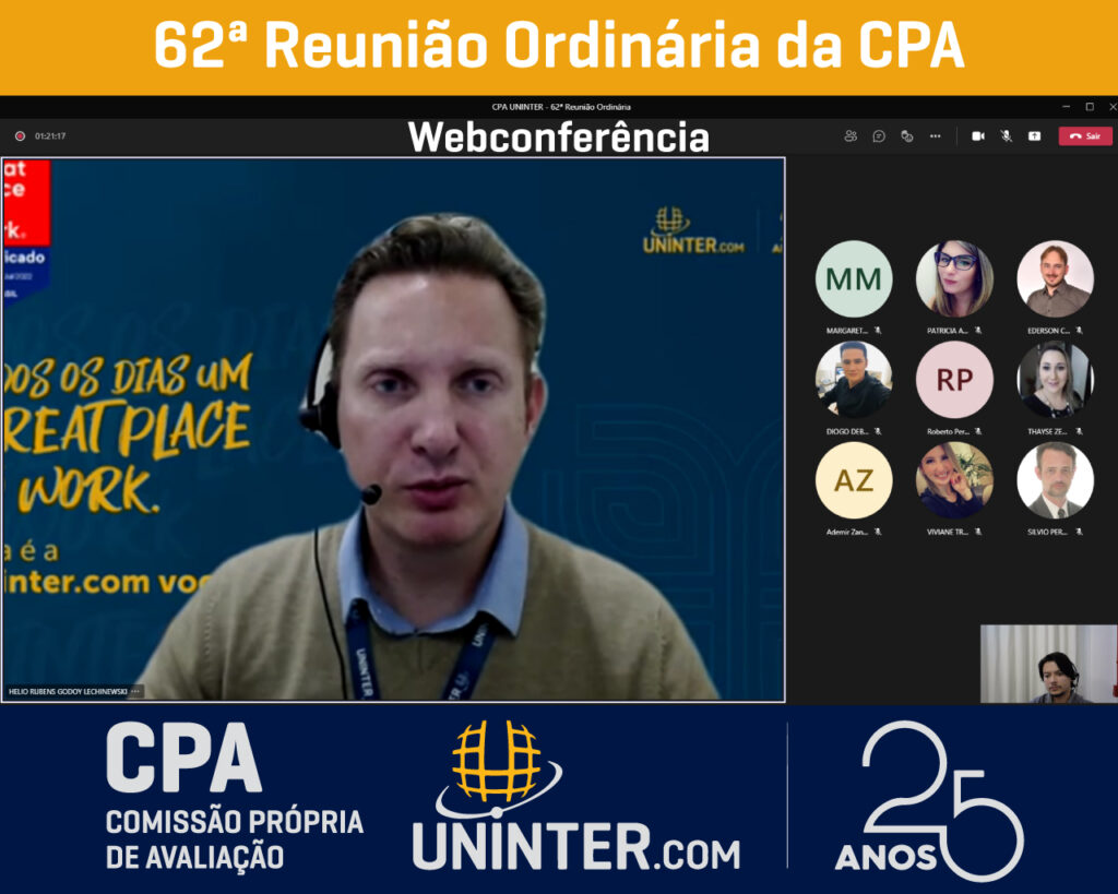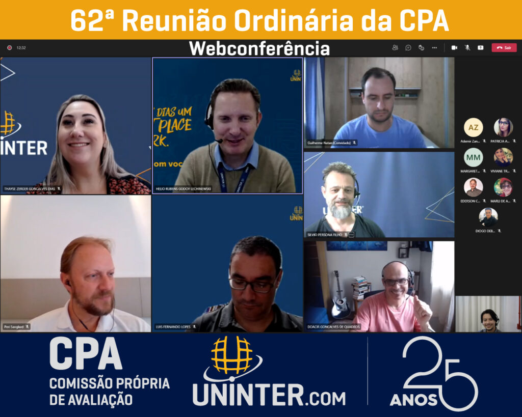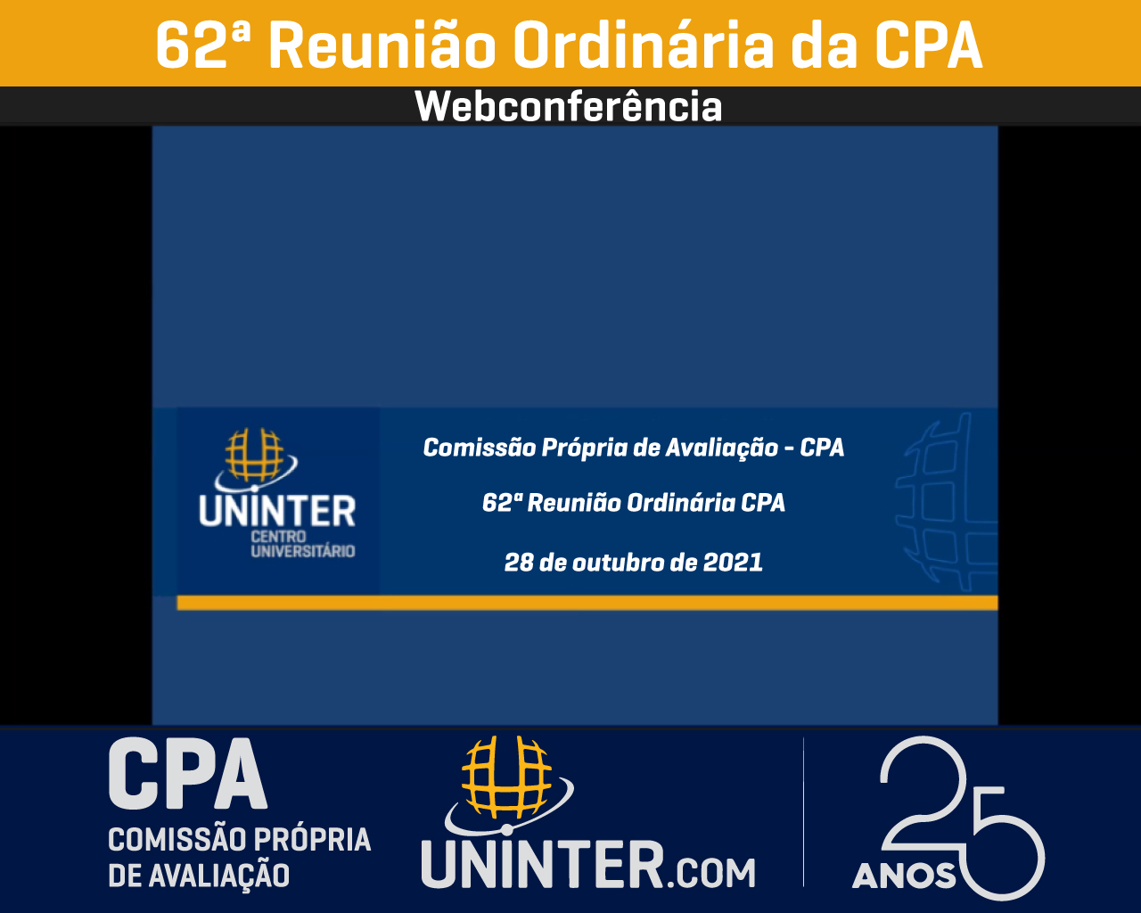 📊No dia 28 de outubro 2021 realizamos a 62ª Reunião Ordinária da CPA da UNINTER. Com os representantes reunidos remotamente participando por meio de webconferência na plataforma Teams.