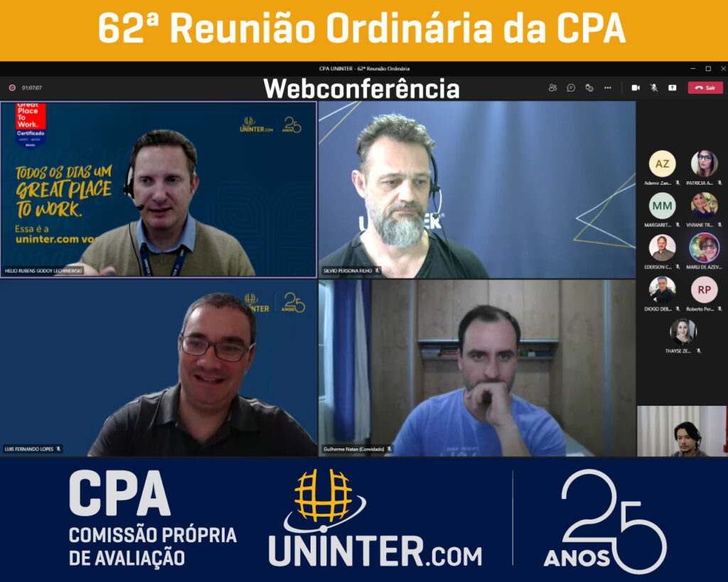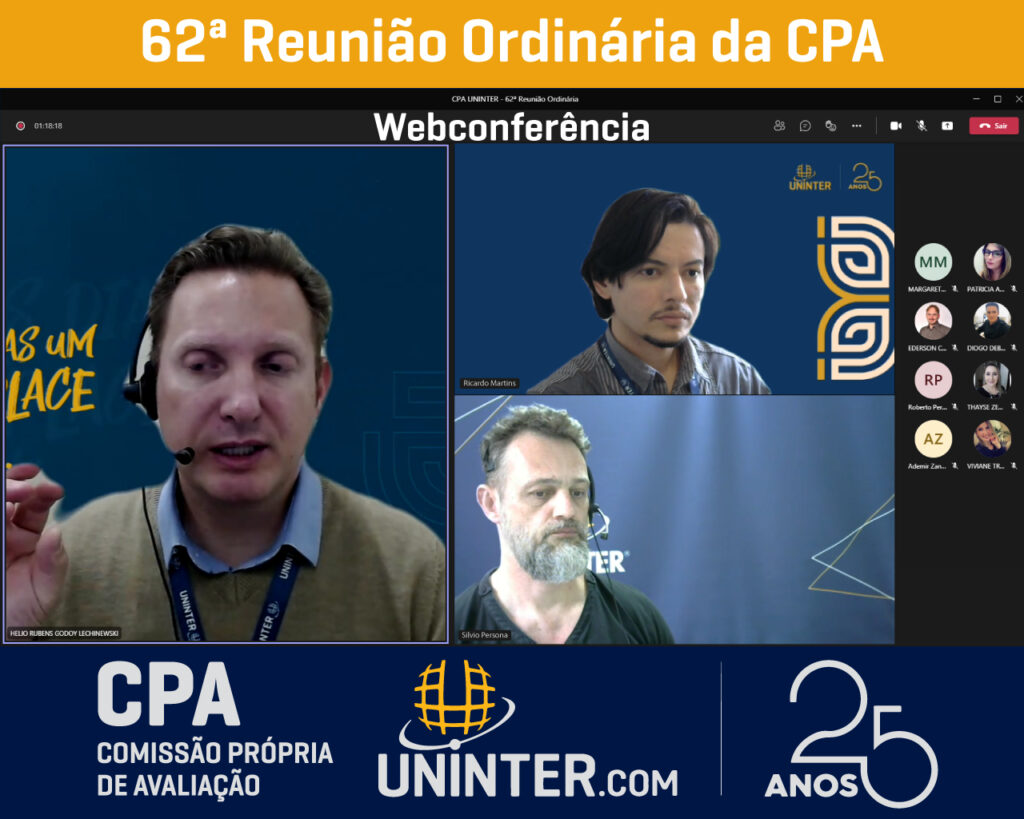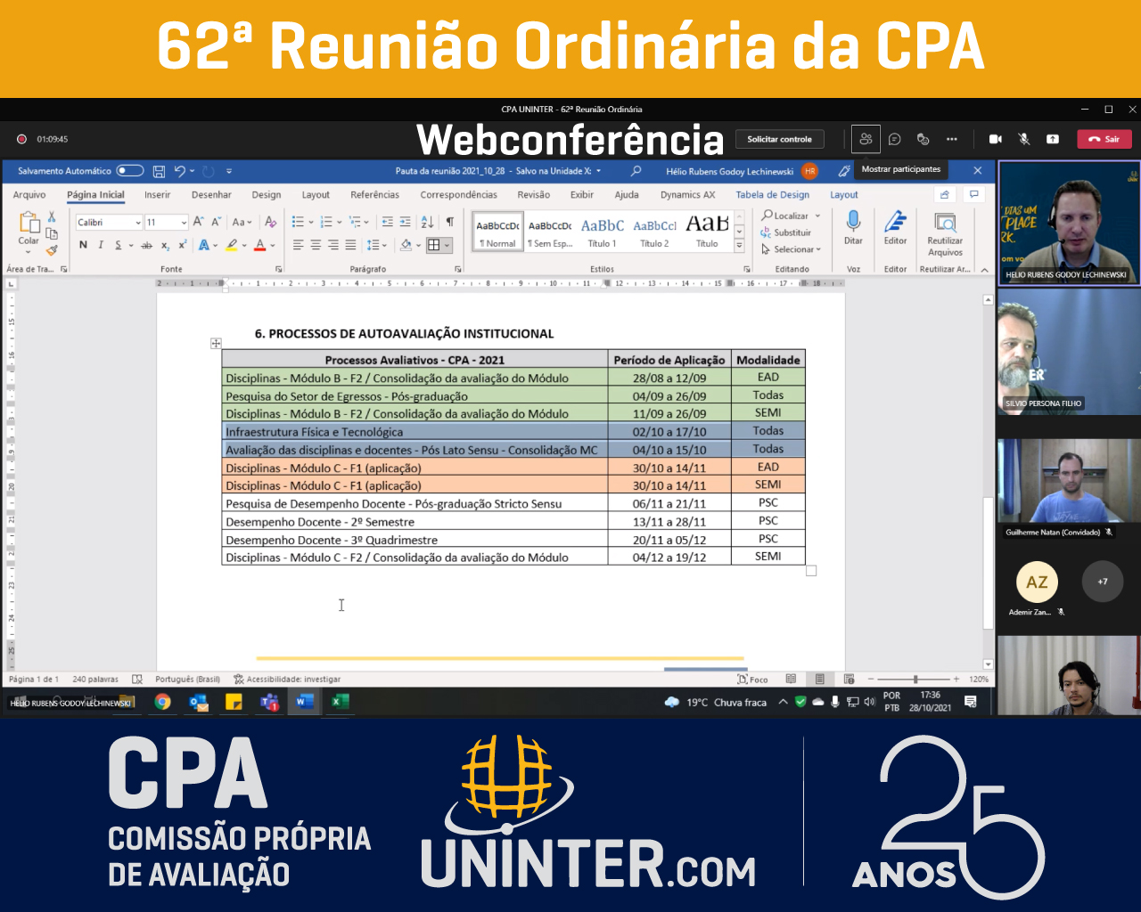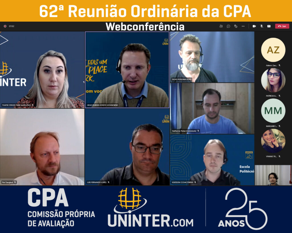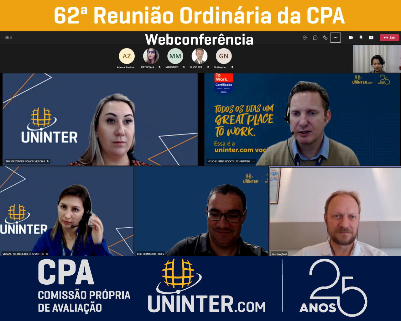 📊No dia 28 de outubro 2021 realizamos a 62ª Reunião Ordinária da CPA da UNINTER. Com os representantes reunidos remotamente participando por meio de webconferência na plataforma Teams.