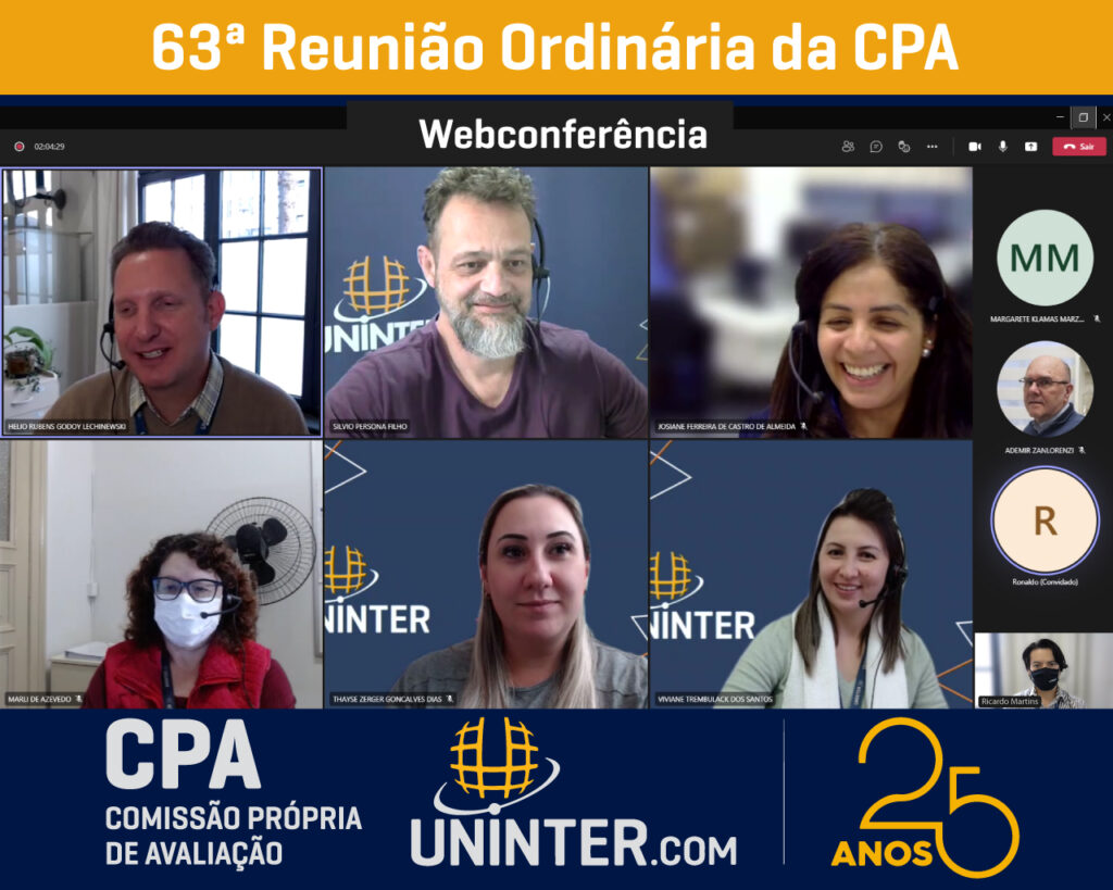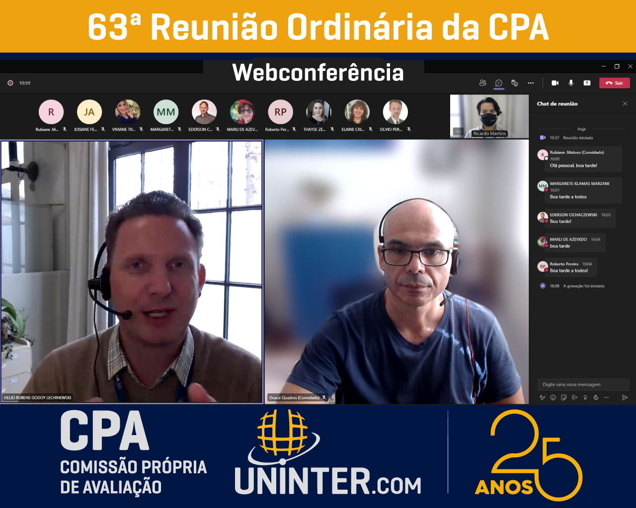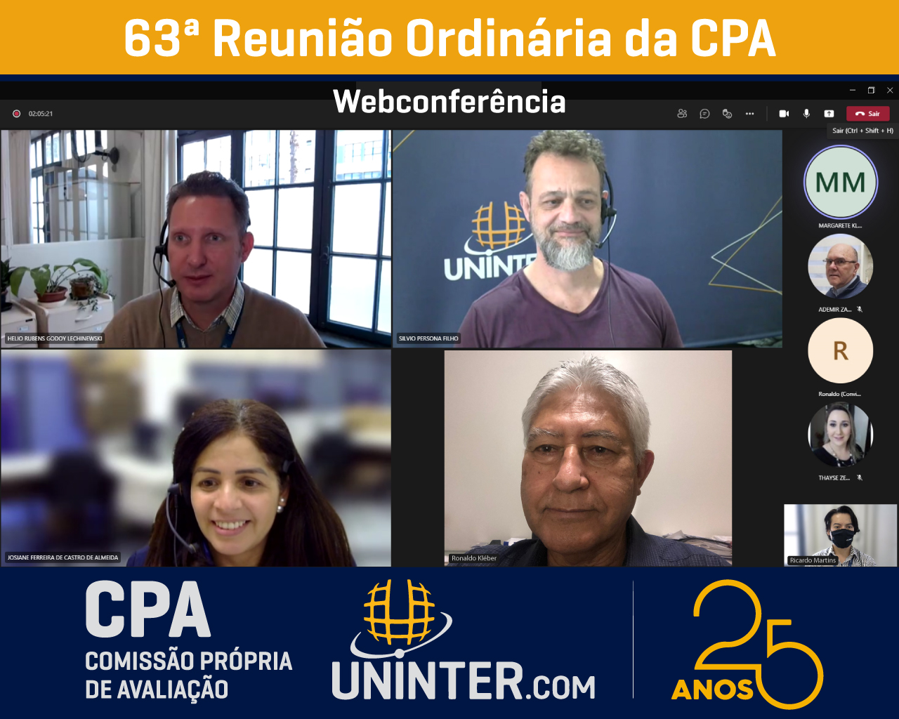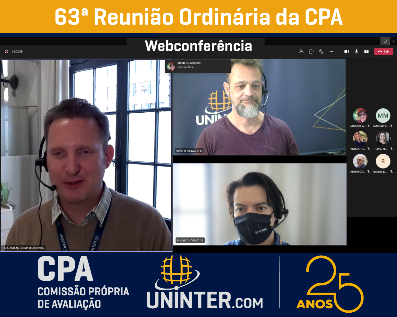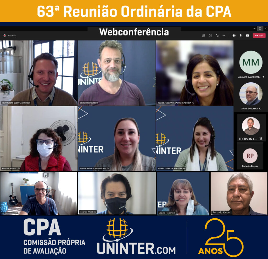 📊No dia 08 de dezembro 2021 realizamos a 63ª Reunião Ordinária da CPA da UNINTER, última do ano de 2021. Com os representantes reunidos remotamente participando por meio de webconferência na plataforma Teams.