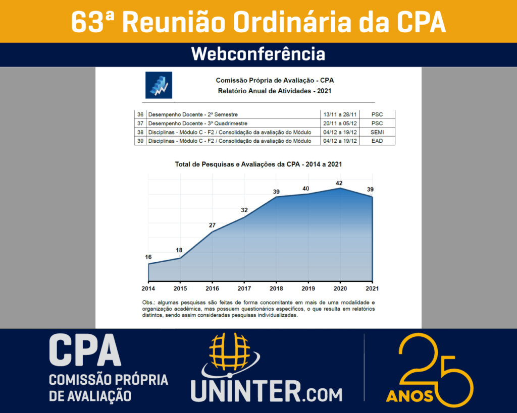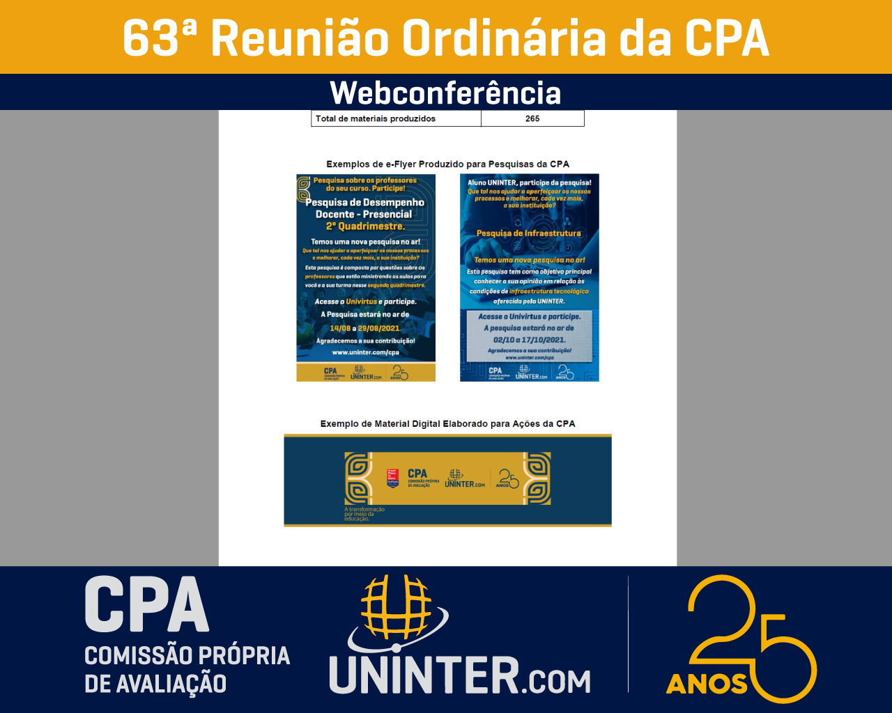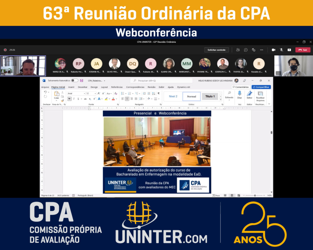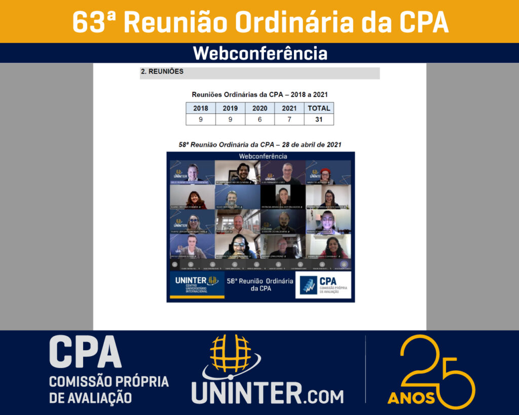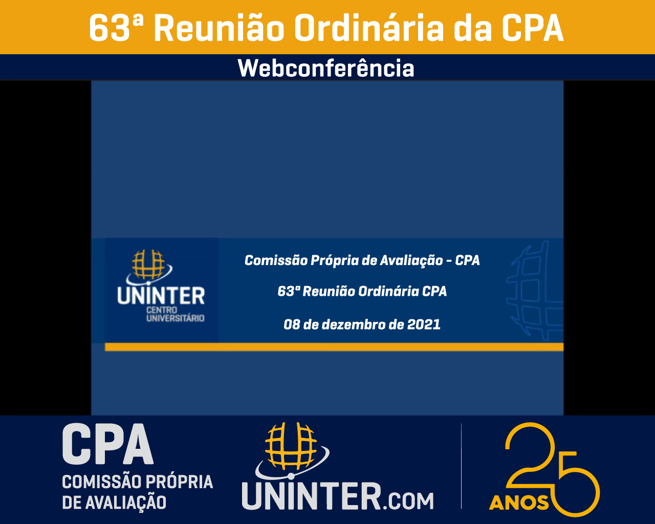 📊No dia 08 de dezembro 2021 realizamos a 63ª Reunião Ordinária da CPA da UNINTER, última do ano de 2021. Com os representantes reunidos remotamente participando por meio de webconferência na plataforma Teams.