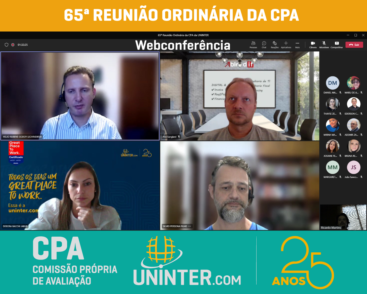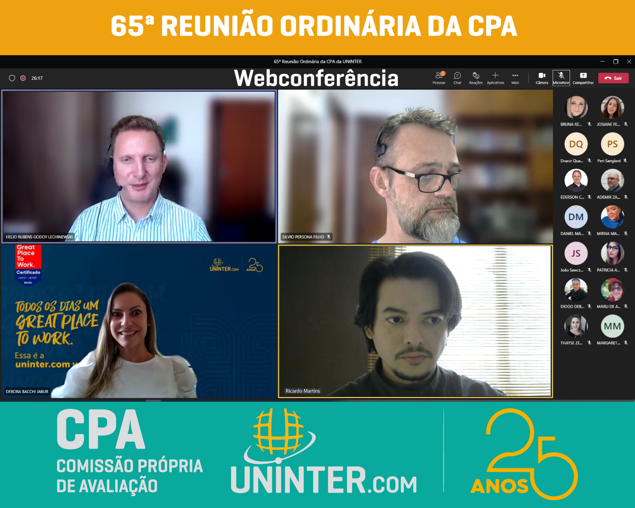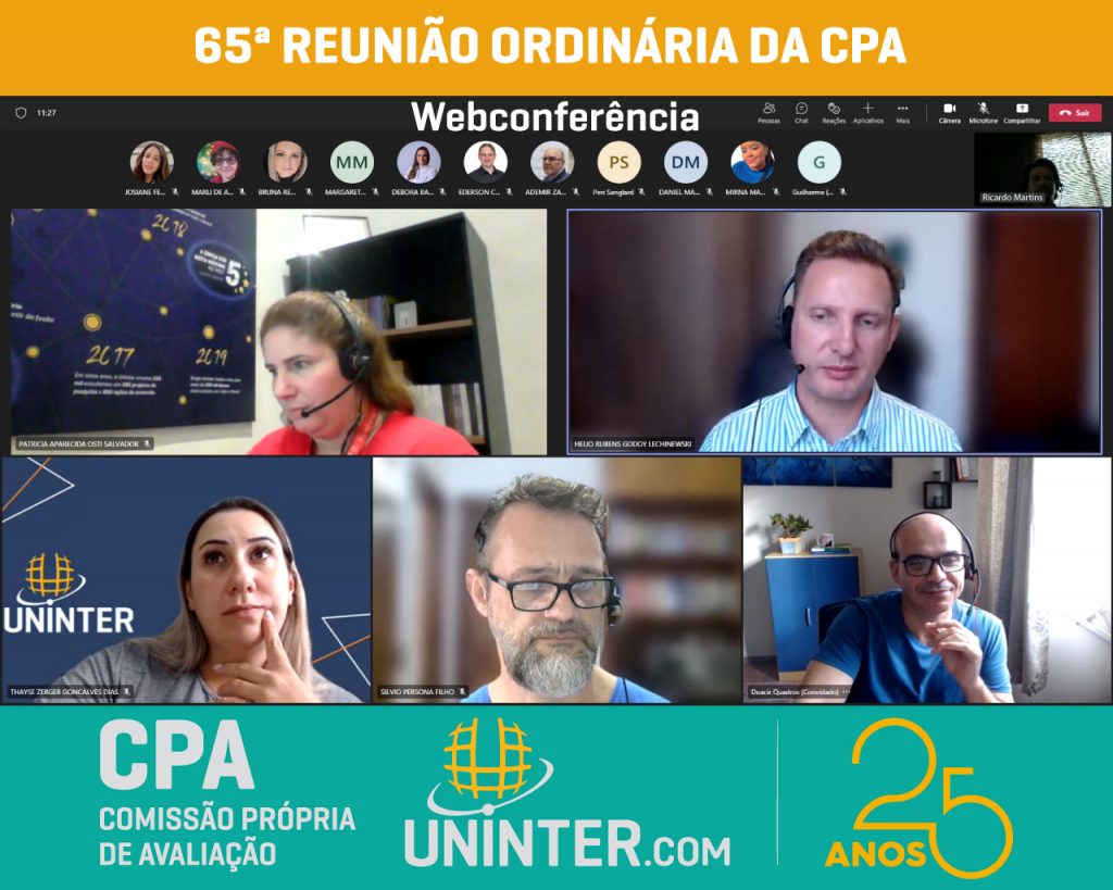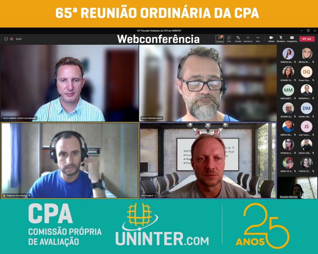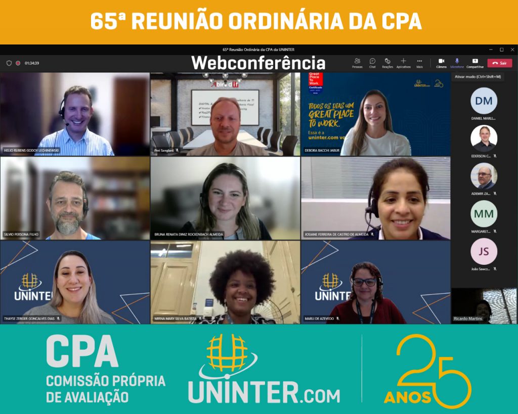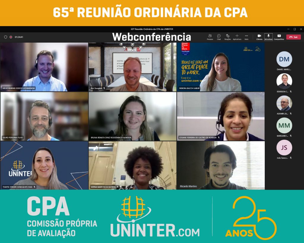 No dia 13 de abril de 2022 realizamos a 65ª Reunião Ordinária da CPA da UNINTER. Com os representantes reunidos remotamente, participando por meio de webconferência na plataforma Teams.