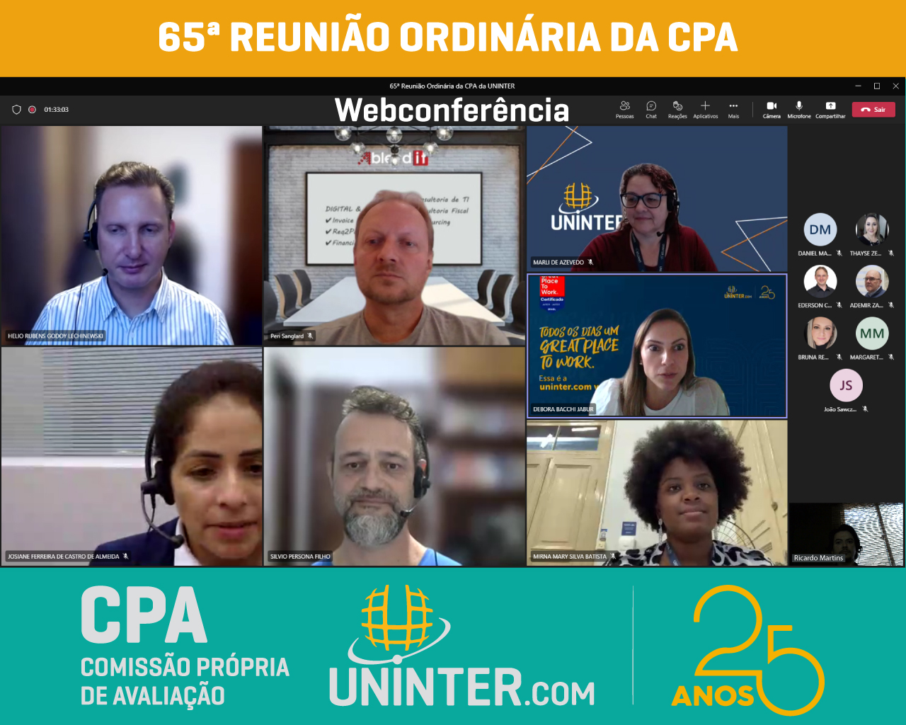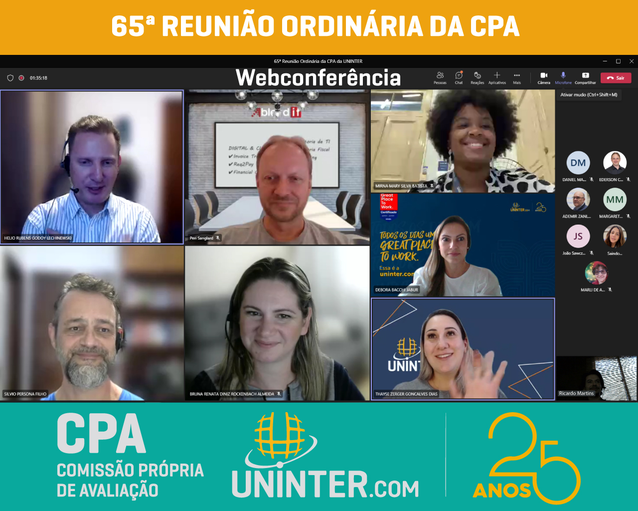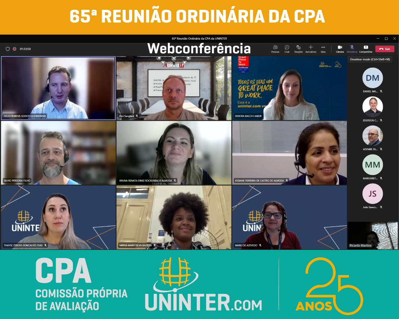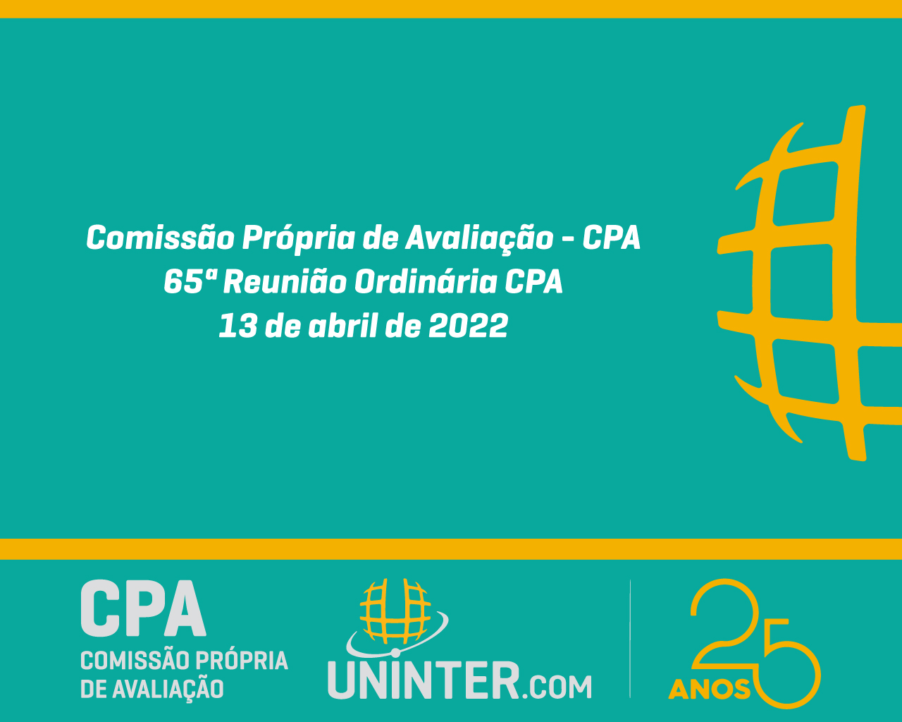 No dia 13 de abril de 2022 realizamos a 65ª Reunião Ordinária da CPA da UNINTER. Com os representantes reunidos remotamente, participando por meio de webconferência na plataforma Teams.