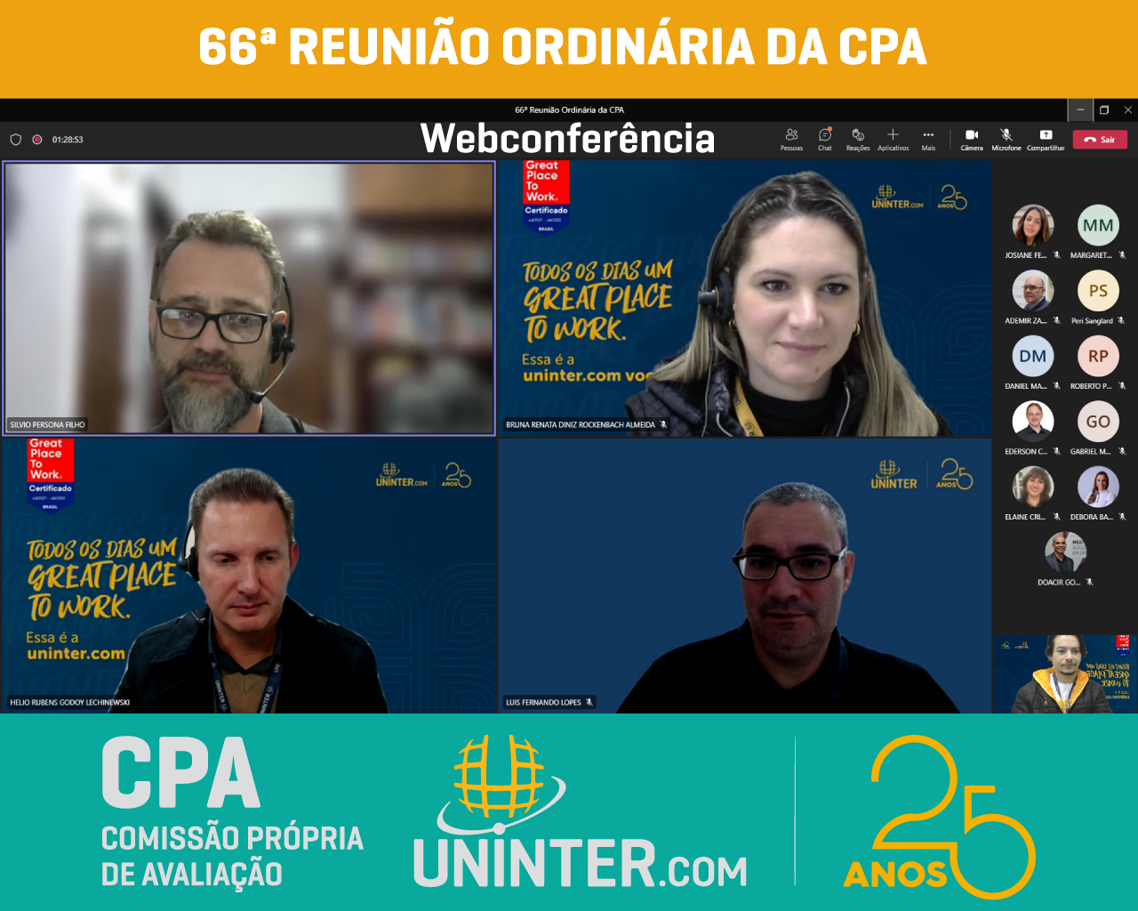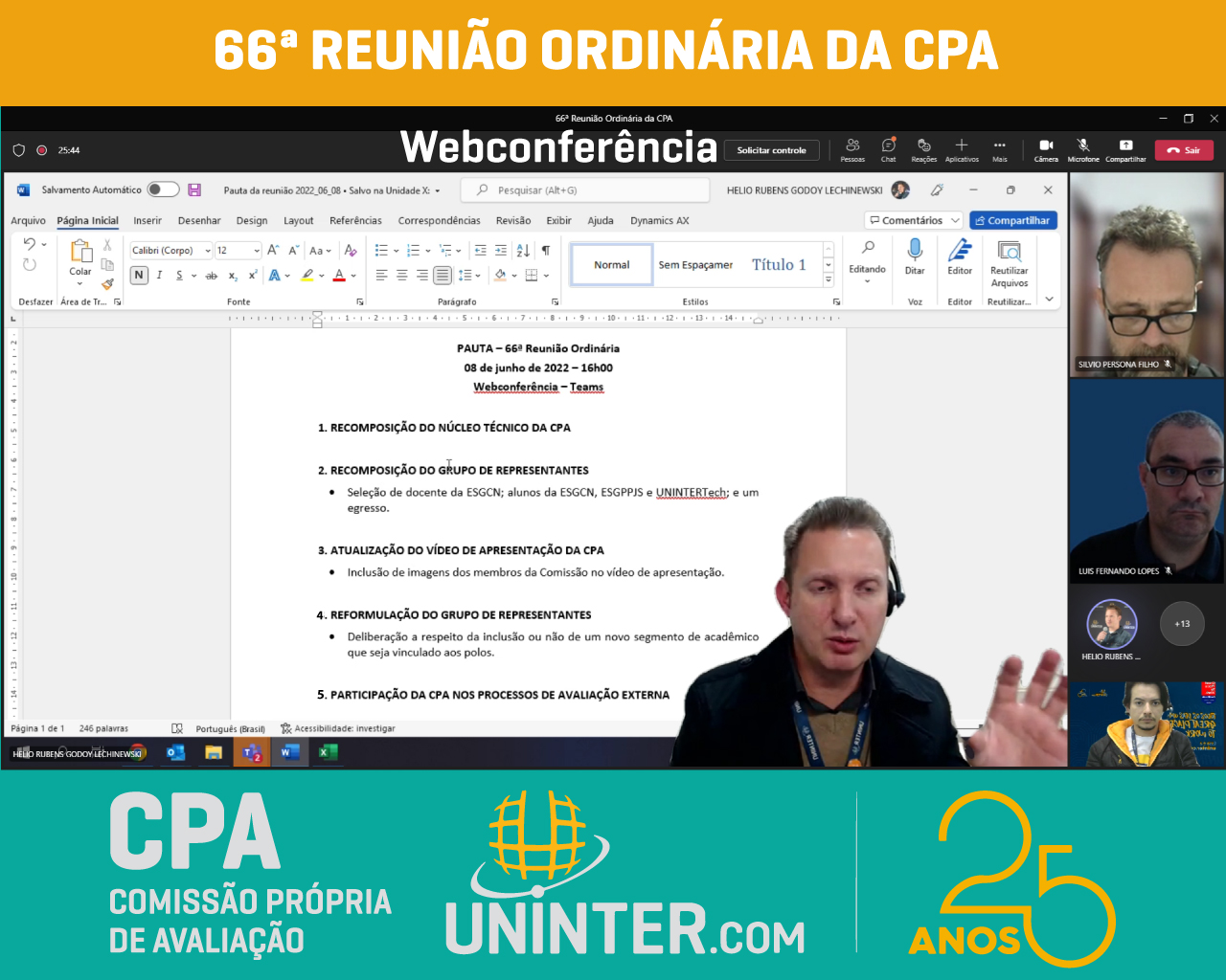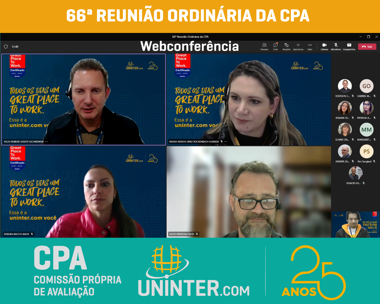 📊No dia 08 de junho de 2022 realizamos a 66ª Reunião Ordinária da CPA da UNINTER. Com os representantes reunidos remotamente, participando por meio de webconferência na plataforma Teams.