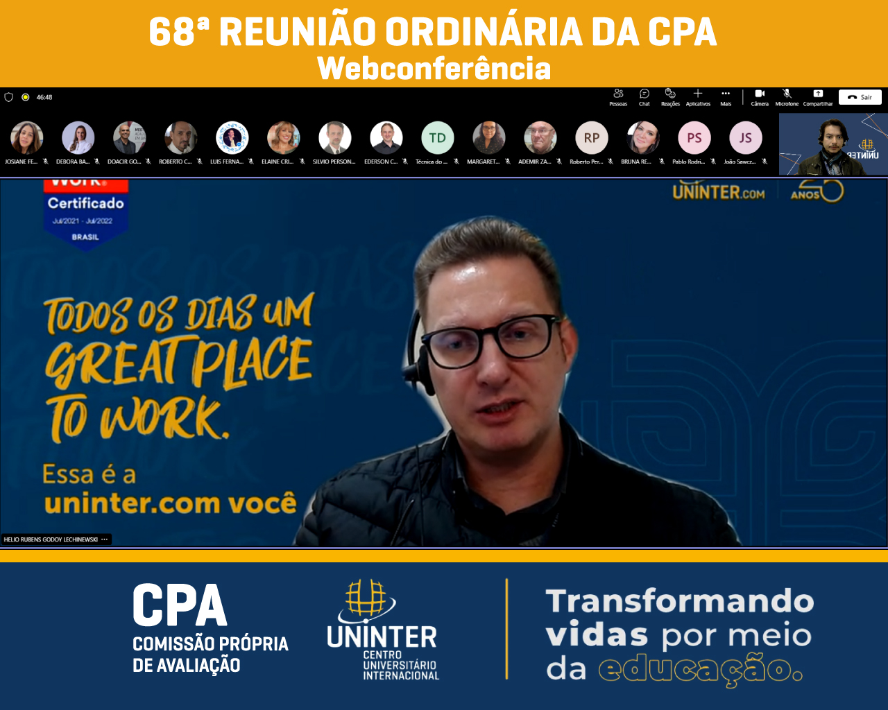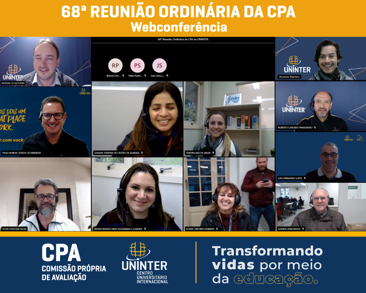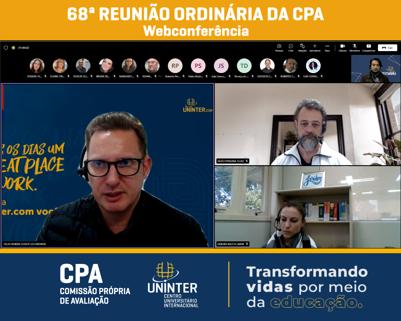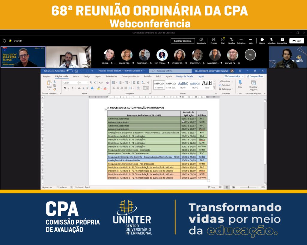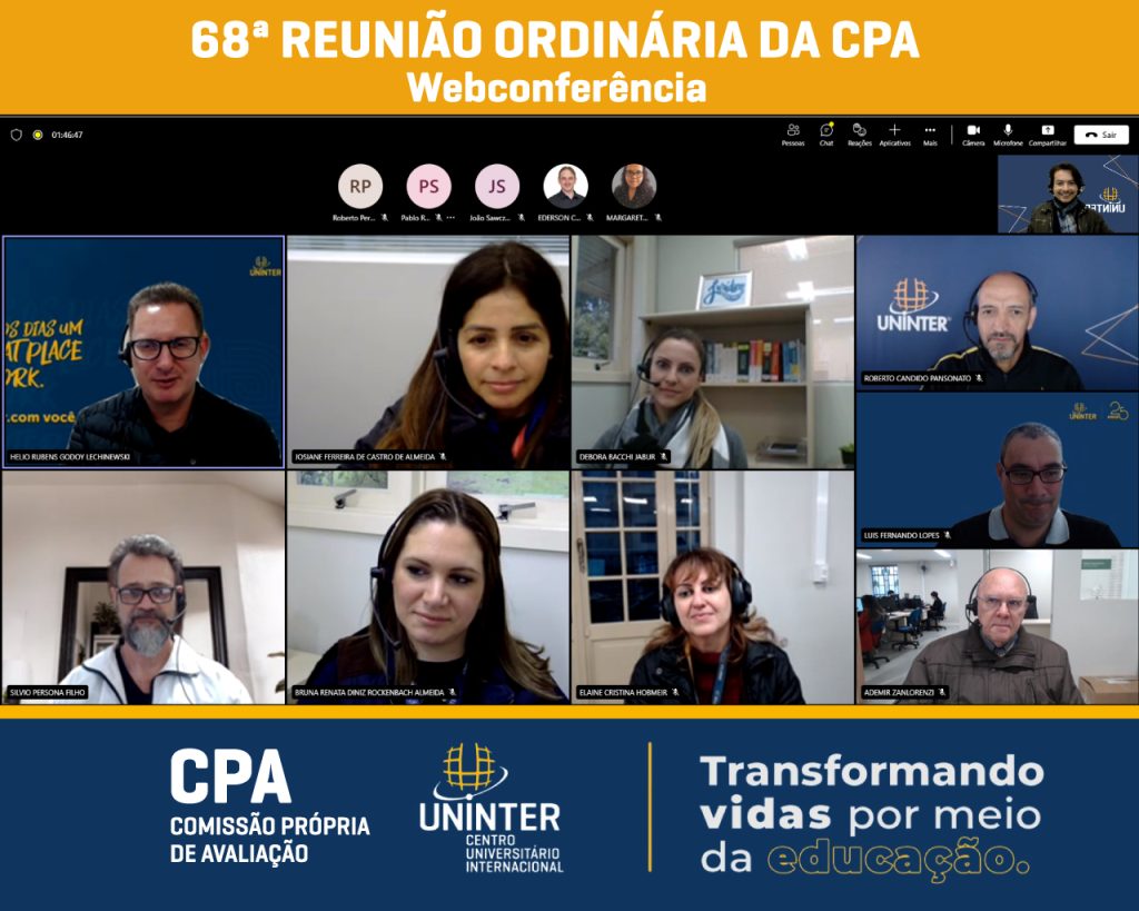 No dia 14 de setembro de 2022 realizamos a 68ª Reunião Ordinária da CPA da UNINTER. Com os representantes reunidos remotamente, participando por meio de webconferência na plataforma Teams.