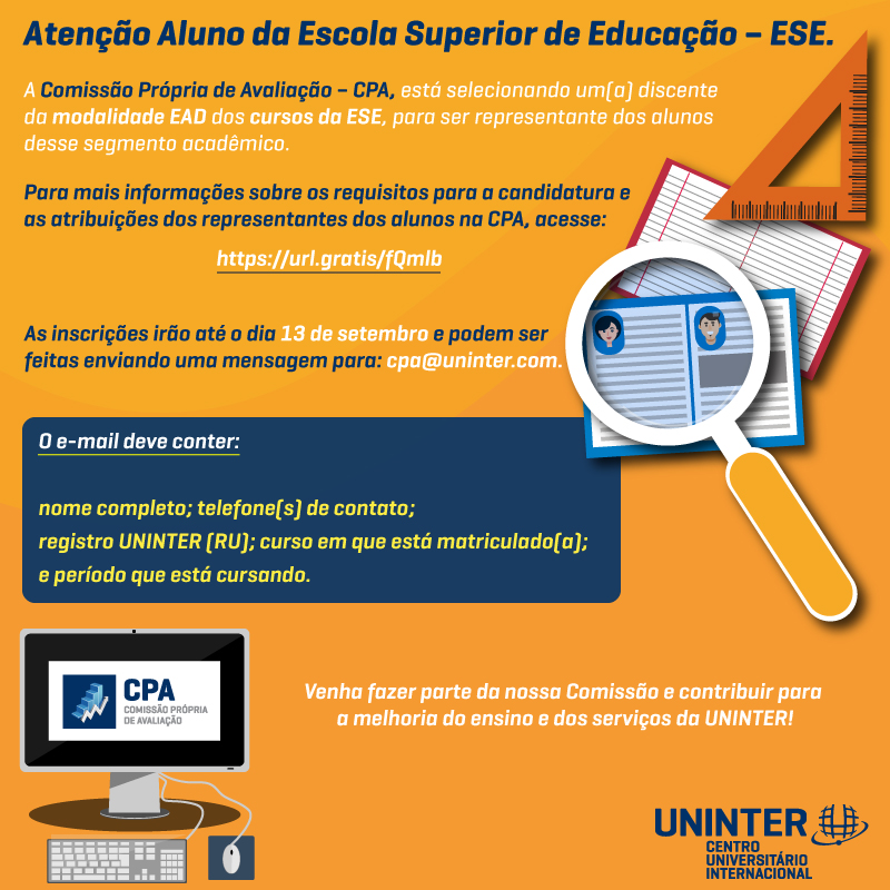 A Comissão Própria de Avaliação – CPA está selecionando um(a) discente da
