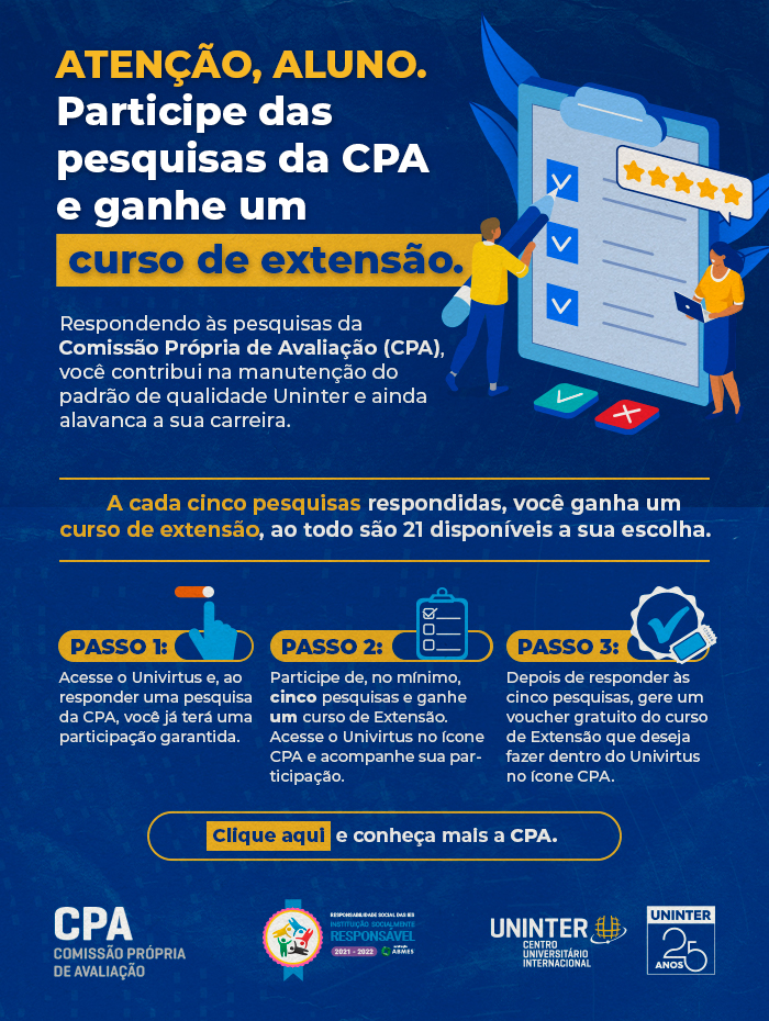 Atenção, aluno. Participe das pesquisas da CPA e ganhe um curso de extensão.