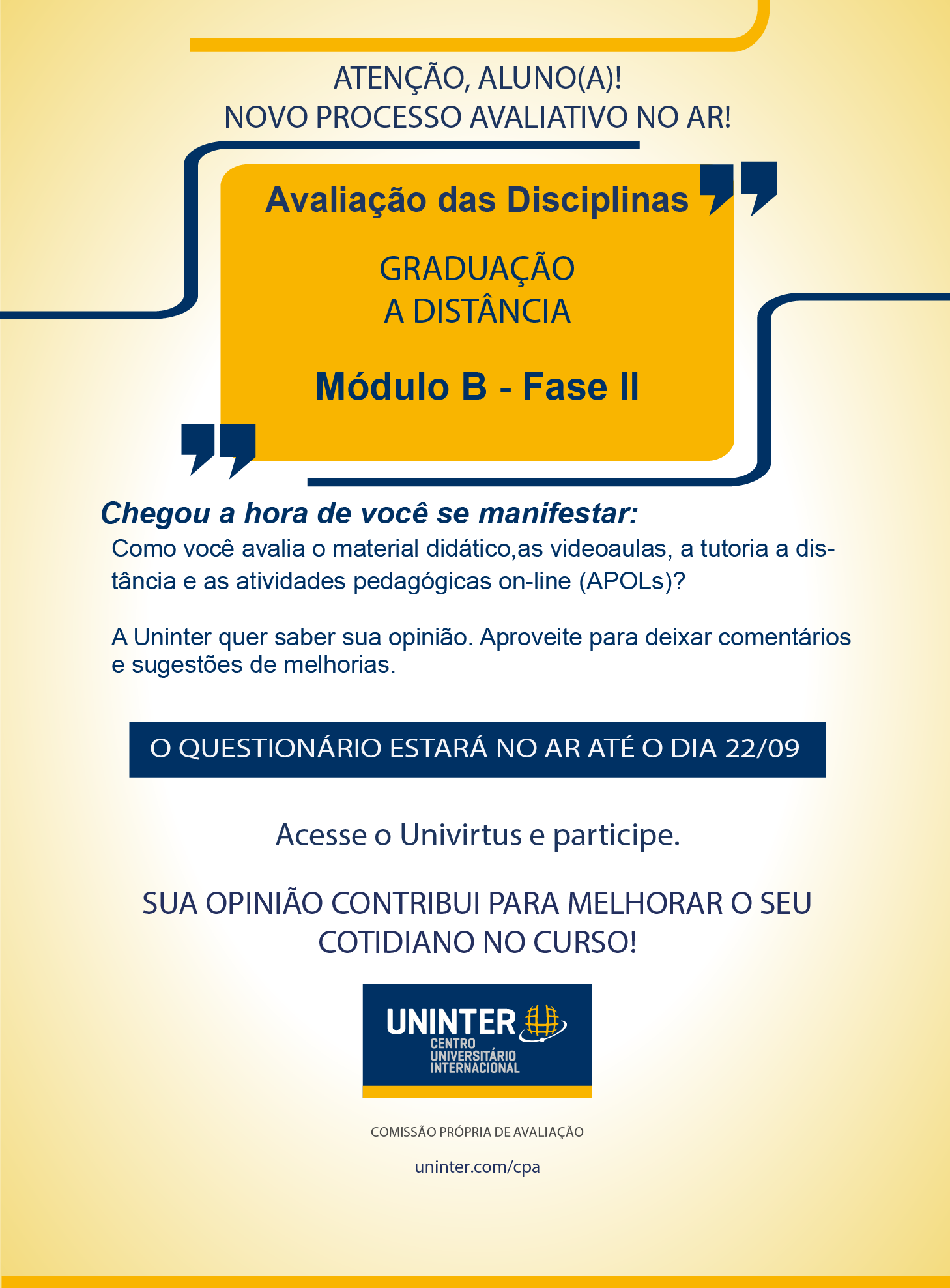 avaliação das disciplinas da Fase II do Módulo B, dos cursos de graduação na modalidade EAD. Os discentes dessas graduações, poderão avaliar as videoaulas, o material didático, as APOL's, as práticas, e a tutoria on-line das disciplinas que foram ministradas no período.