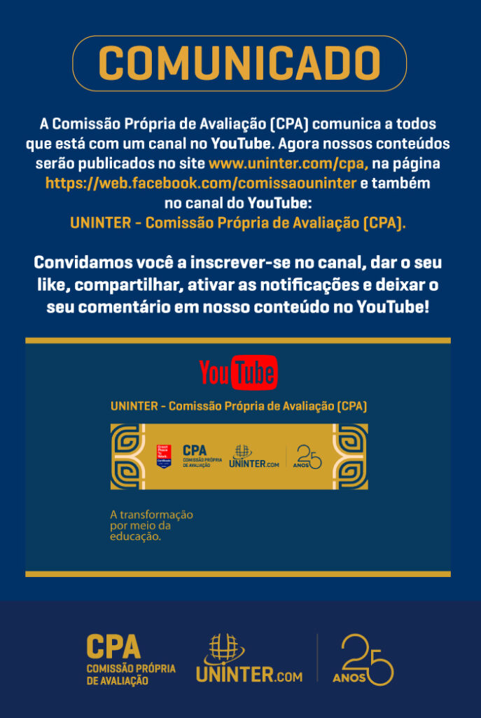 A Comissão Própria de Avaliação (CPA) comunica a todos que está com um canal no YouTube. Agora nossos conteúdos serão publicados no site https://www.uninter.com/cpa/ na página https://web.facebook.com/comissaouninter e também no canal do YouTube: UNINTER – Comissão Própria de Avaliação (CPA).