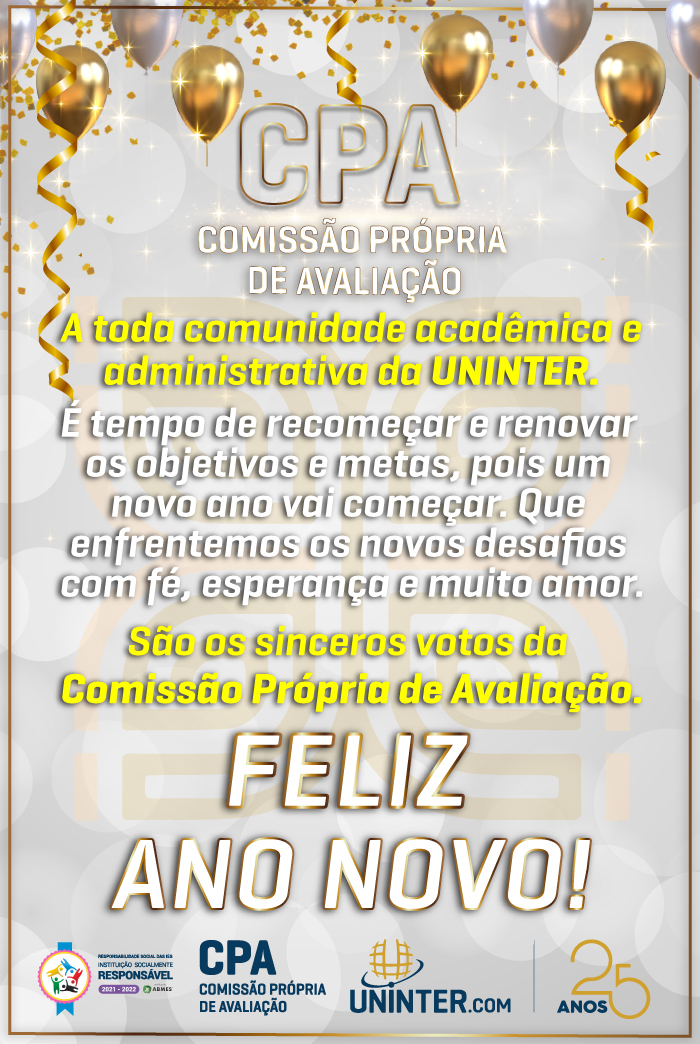 Logotipos da COMISSÃO PRÓPRIA DE AVALIAÇÃO (CPA), do selo de responsabilidade social da ABMES/IBGPEX e da nova identidade visual em comemoração aos 25 anos do UNINTER compõem a parte inferior da peça.