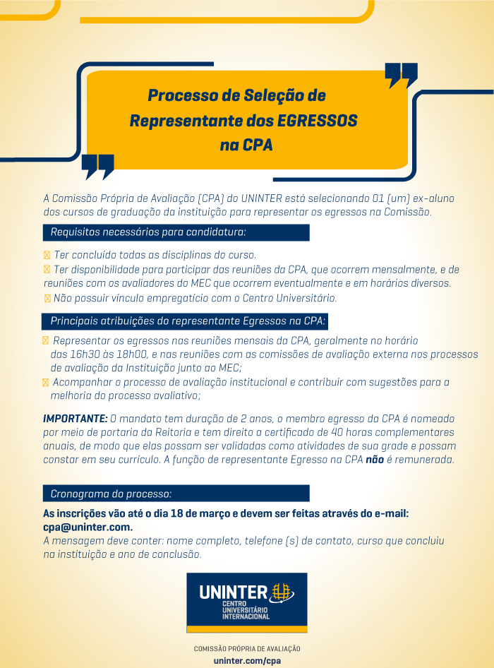 Inscrições abertas – Seleção de Representante dos Egressos na Comissão
