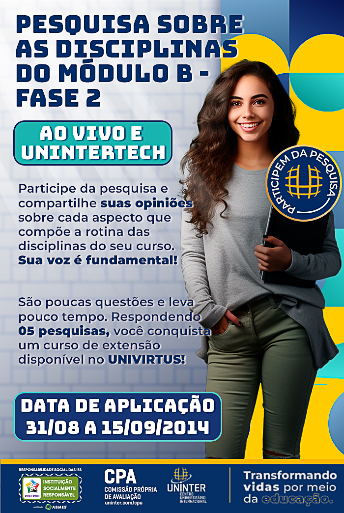 E-Flyer – Disciplinas – AO VIVO e UNINTERTECH – Módulo B – Fase 2 – 2024 Publicado 2 de setembro de 2024 às 700 × 1044 em Pesquisa das Disciplinas – AO VIVO e UNINTERTECH – Módulo B – Fase 2 – 2024