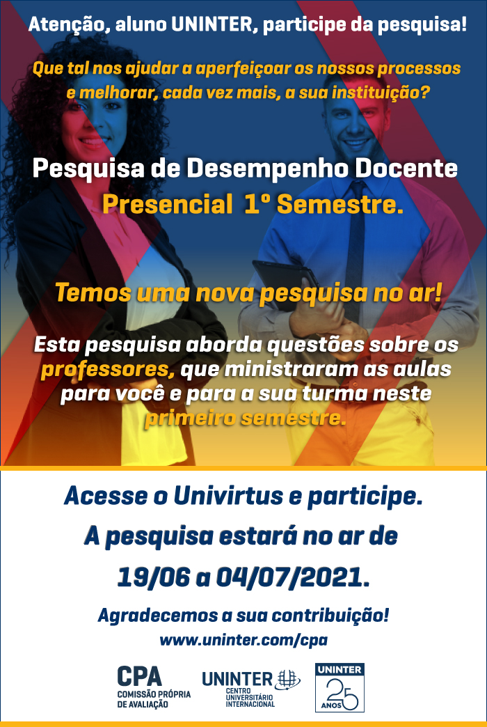 Uma caixa de texto branca com bordas amarelas com os logotipos da COMISSÃO PRÓPRIA DE AVALIAÇÃO, CPA, e da nova identidade visual em comemoração aos 25 anos do GRUPO UNINTER compõem a peça na parte inferior.