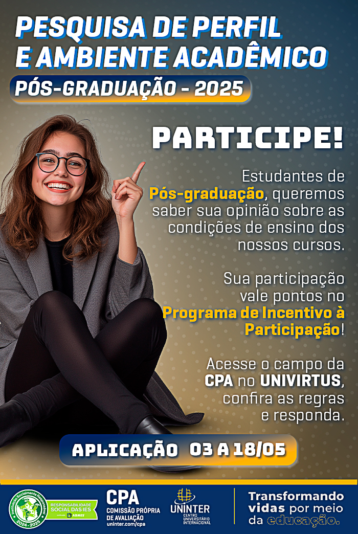 E-FLYER – Pesquisa Pós-Graduação – 2025 Publicado 19 de maio de 2025 às 700 × 1044 em Pesquisa de Perfil e Ambiente Acadêmico – Pós-Graduação (2025)