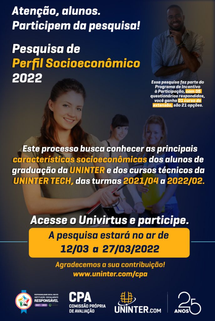 Logotipos da COMISSÃO PRÓPRIA DE AVALIAÇÃO (CPA), do selo de responsabilidade social da ABMES/IBGPEX e da nova identidade visual em comemoração aos 25 anos do UNINTER compõem a parte inferior da peça.