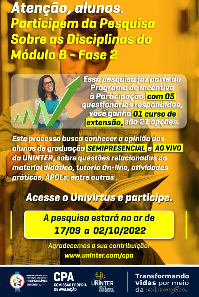 Este processo busca conhecer a opinião dos alunos de graduação SEMIPRESENCIAL e AO VIVO da UNINTER, sobre questões relacionadas ao material didático, tutoria On-line, atividades práticas, APOLs, entre outras.