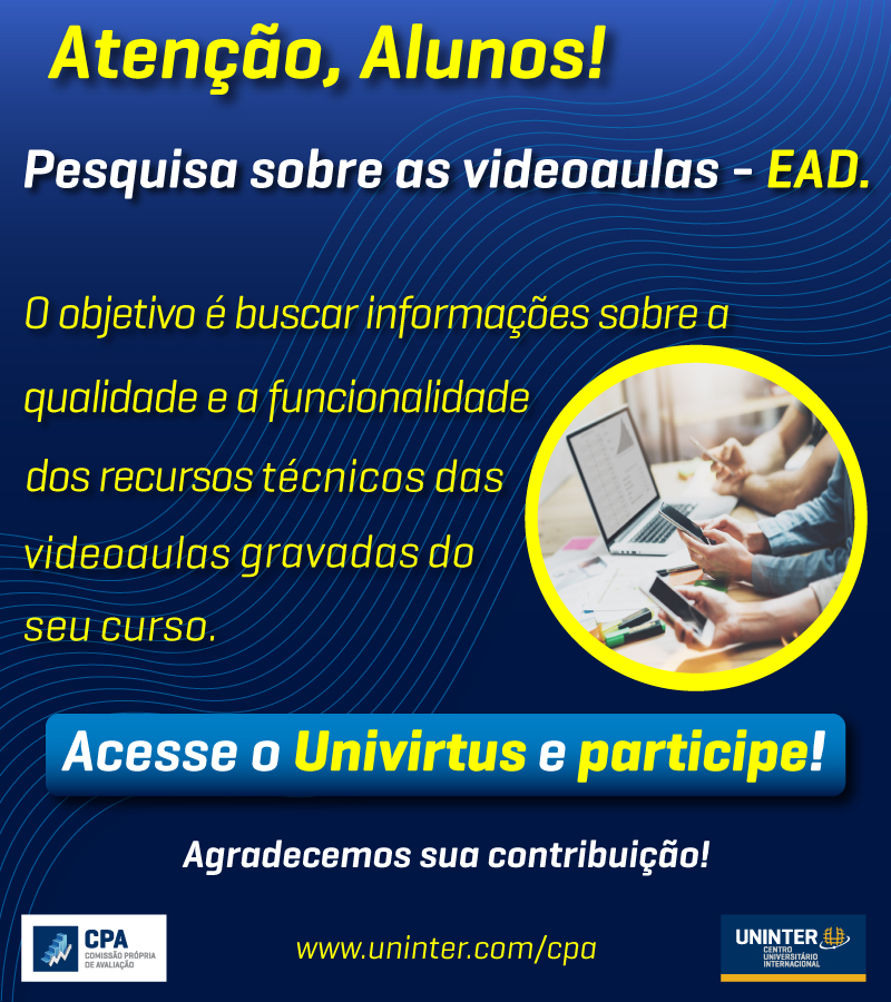 Uma caixa de texto, em degradê, nas cores azul claro e escuro, estão na peça juntamente com os logotipos do CENTRO UNIVERSITÁRIO INTERNACIONAL e COMISSÃO PRÓPRIA DE AVALIAÇÃO na parte inferior.
