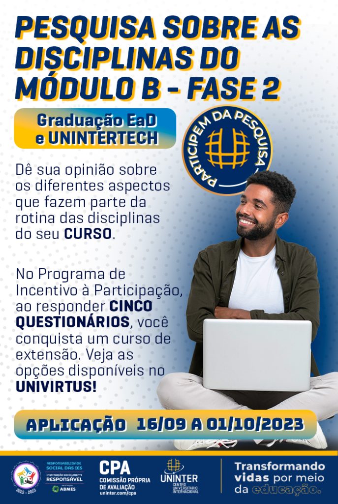 Pesquisa Sobre Avaliação das Disciplinas – Módulo B – EaD e UNINTERTECH – Fase 2
