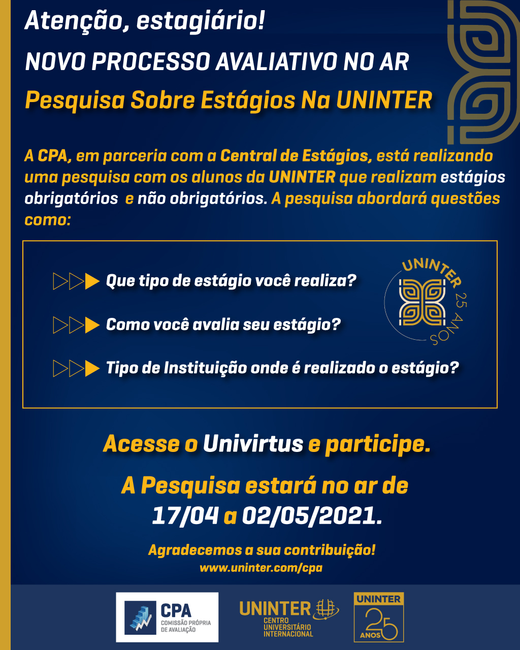 Em uma caixa de texto, na cor azul escuro, logotipos da COMISSÃO PRÓPRIA DE AVALIAÇÃO, CPA, e da nova identidade visual em comemoração aos 25 anos do CENTRO UNIVERSITÁRIO INTERNACIONAL UNINTER compõem a peça na parte inferior.