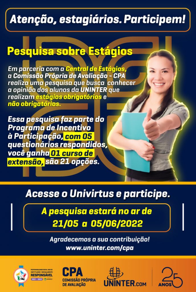 Logotipos da COMISSÃO PRÓPRIA DE AVALIAÇÃO (CPA), do selo de responsabilidade social da ABMES/IBGPEX e da nova identidade visual em comemoração aos 25 anos do UNINTER compõem a parte inferior da peça.