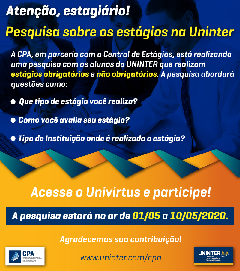 A CPA, em parceria com a Central de Estágios, está realizando uma pesquisa com os alunos da UNINTER que realizam estágios obrigatórios e não obrigatórios. A pesquisa abordará questões como: