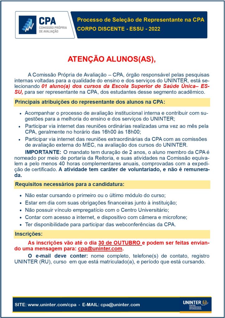 IMPORTANTE: O mandato tem duração de 2 anos, o aluno membro da CPA é nomeado por meio de portaria da Reitoria, e suas atividades na Comissão equivalem a pelo menos 40 horas complementares anuais, comprovadas com a expedição de certificado.