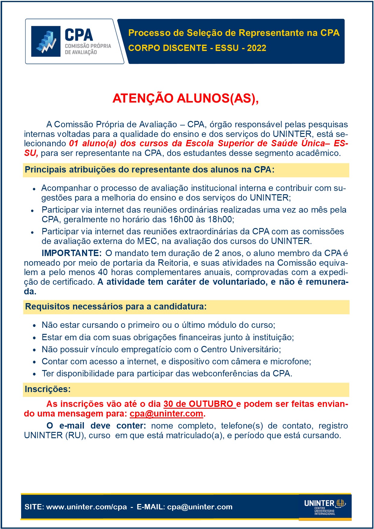 01 aluno(a) dos cursos da Escola Superior de Saúde Única– ESSU, para ser representante na CPA, dos estudantes desse segmento acadêmico.