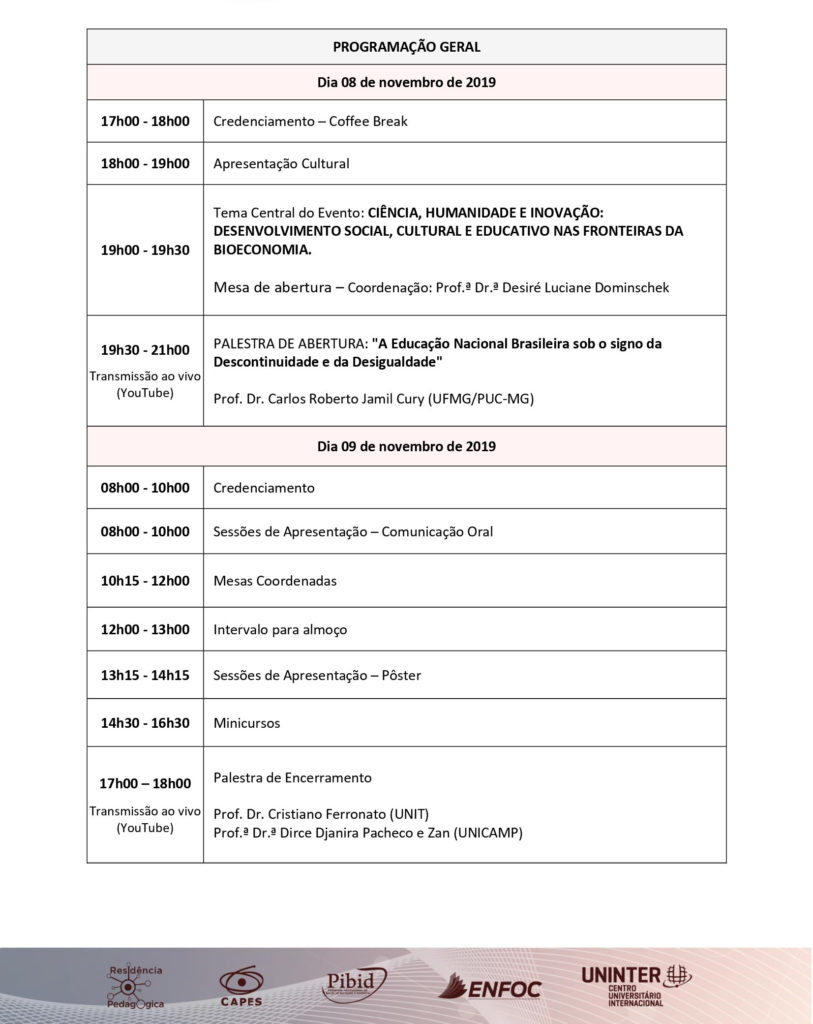O XV ENFOC – Encontro de Iniciação Científica, XIV Fórum Científico, VI Seminário PIBID – Programa Institucional de Bolsa de Iniciação à Docência e I Seminário do Programa de Residência Pedagógica acontecerá nos dias 08 e 09 de novembro de 2019, na cidade de Curitiba – PR, e tem como objetivos: