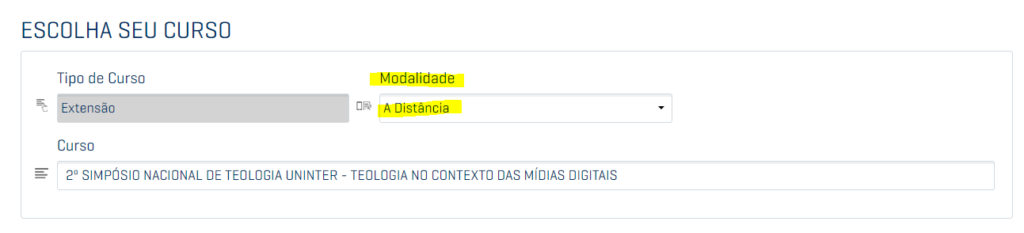 Para ambas as modalidades, é preciso escolher a modalidade A DISTÂNCIA, conforme visto abaixo: