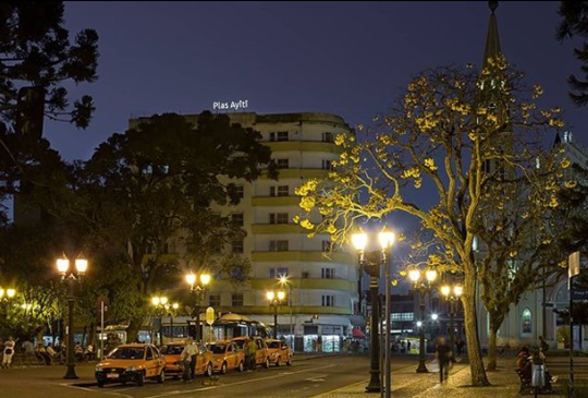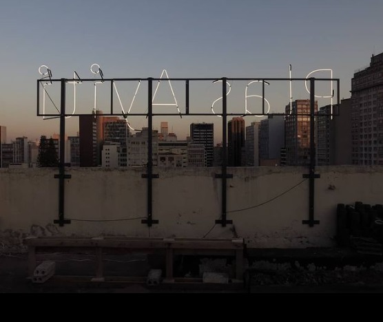 Instalação de neon de 4,5 x 1,00 m no topo do edifício “Nossa senhora da Luz” na Praça Tiradentes, em Curitiba, 2014.