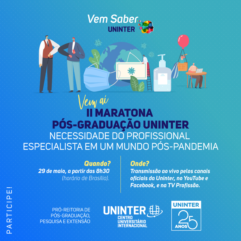 Os professores da pós-graduação da Uninter farão 17 lives temáticas para discutir A necessidade de um profissional Especialista em um mundo pós-pandemia. Um grande evento destinado a alunos e também ao público externo, com transmissão ao vivo pelos canais oficiais da Uninter no Youtube e Facebook, e também na TV Profissão (canal 15 da NET em Curitiba e canal 5 para a região metropolitana).