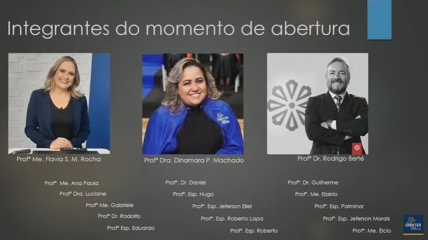 Este ano, o tema em debate foram as “Tecnologias digitais para Matemática, Física e Química”. O evento iniciou às 15h, com abertura realizada pela coordenadora da área, Flávia Sucheck, pela diretora da ESE, Dinamara Machado, e pelo pró-reitor de graduação da Uninter, Rodrigo Berté. O momento contou ainda com a participação de professores dos cursos de Matemática, Física e Química da instituição.