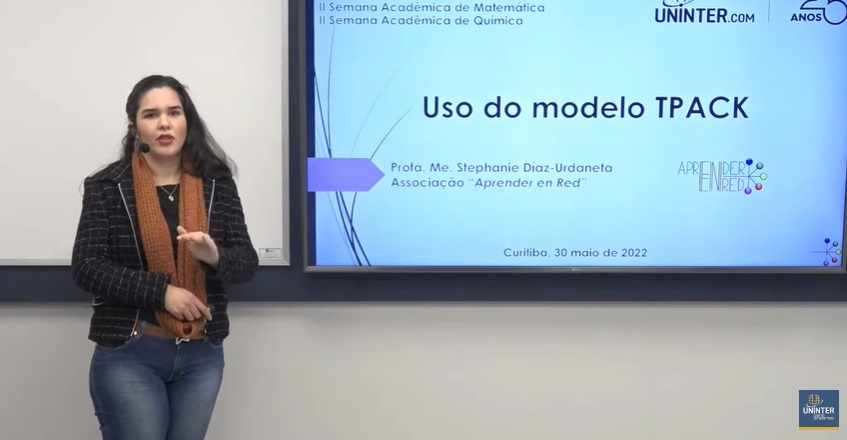 A primeira palestra, que aconteceu na mesma tarde, foi realizada pela professora Stephanie Díaz Urdaneta, mestre em Educação em Ciências e Matemática pela Universidade Federal do Paraná (UFPR), que abordou O uso do modelo TPACK (Technological Pedagogical And Content Knowledge ou Conhecimento Tecnológico Pedagógico do Conteúdo em português) nos processos de ensino. A profissional buscou aprofundar o tema a partir do uso do software Geogebra.