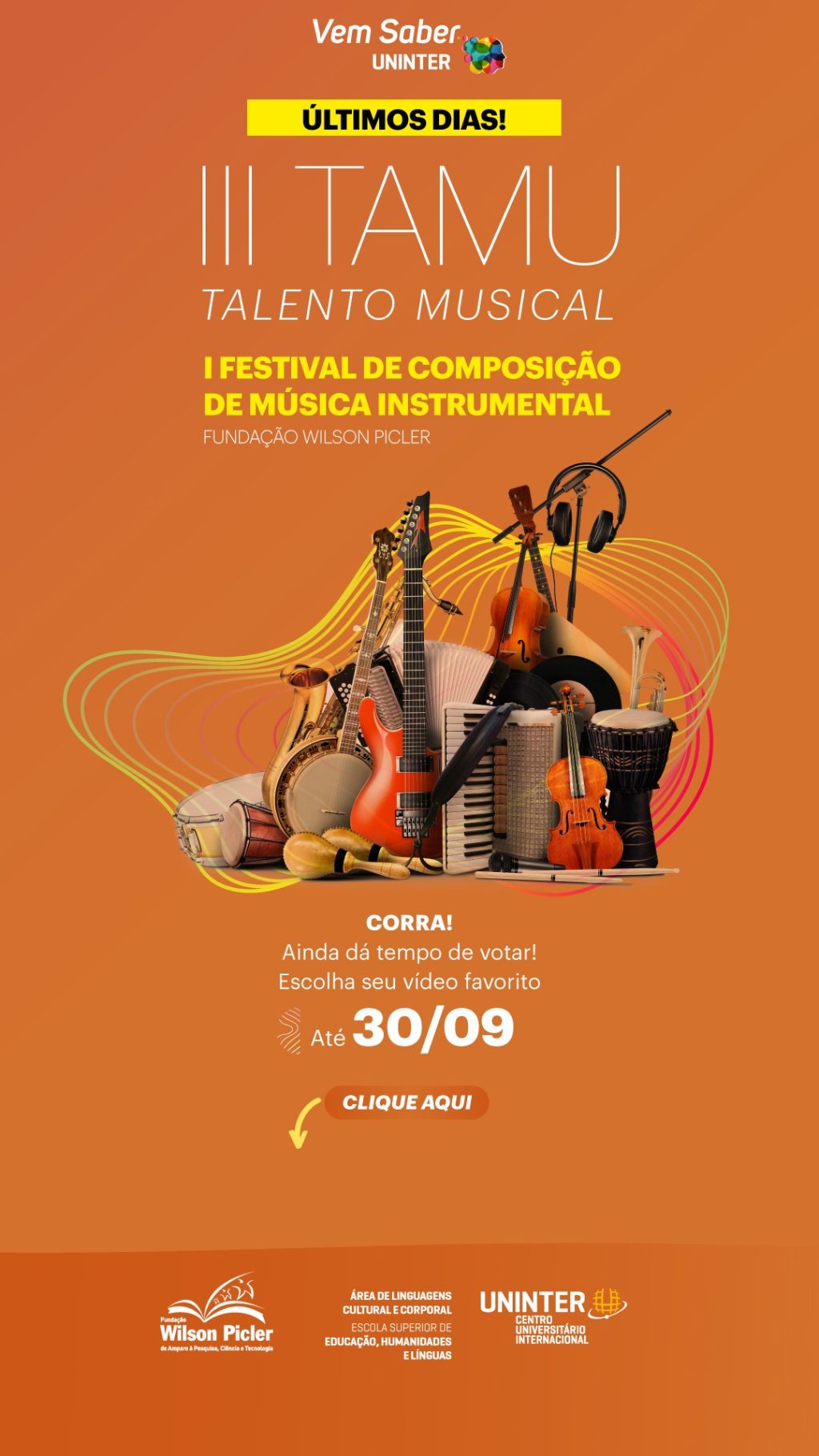 Autor: Pedro Henrique Milano Calandreli - estagiário de jornalismoOrganizado pelo curso de Licenciatura em Música da Uninter, em parceria com a Fundação Wilson Picler, o Talento Musical (TAMU) terá neste ano a sua terceira edição. O evento permite que os competidores possam inscrever suas músicas instrumentais autorais, com chance de ganharem bolsas de estudo.