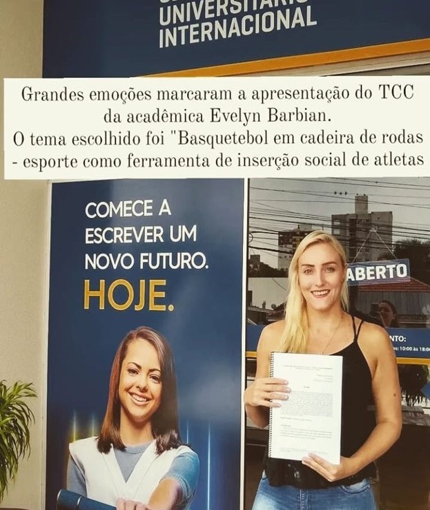 Evelyn apresentou a pesquisa “Basquetebol em cadeira de rodas – esporte como ferramenta de inserção social de atletas” no dia 24 de março de 2022, na qual conquistou nota máxima.