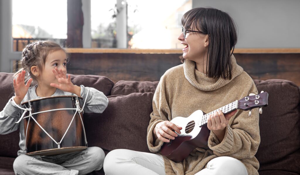 Mom plays with her daughter at home. Lessons on a musical instrument. Children's development and family values. The concept of children's friendship and family.