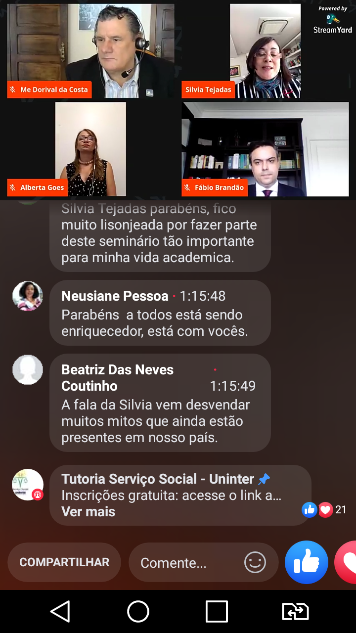 O debate aconteceu através de uma live que você pode assistir a qualquer momento na página da Tutoria Serviço Social Uninter, no Facebook.
