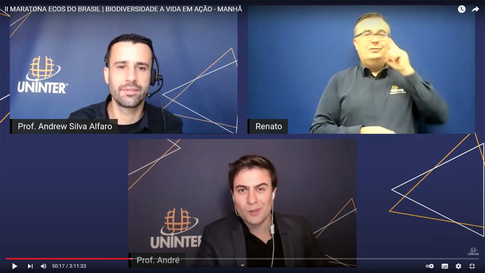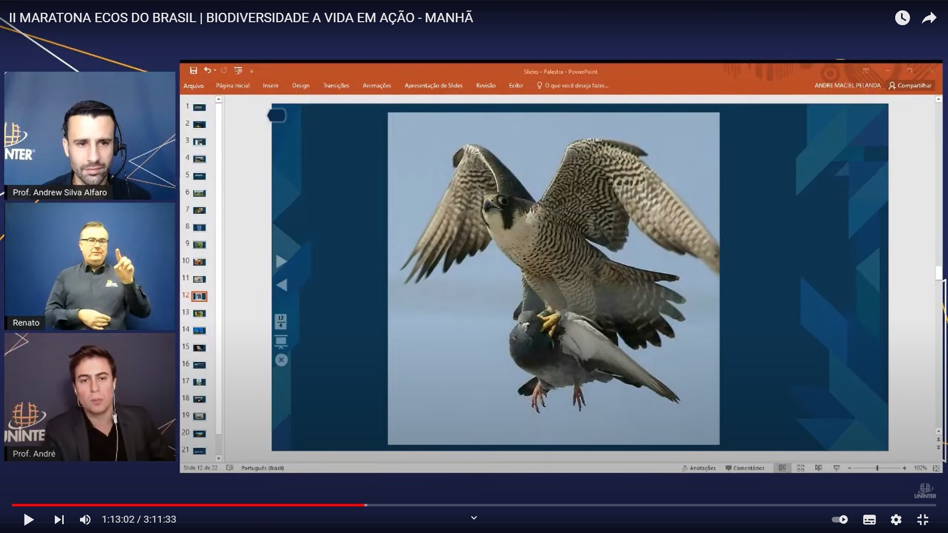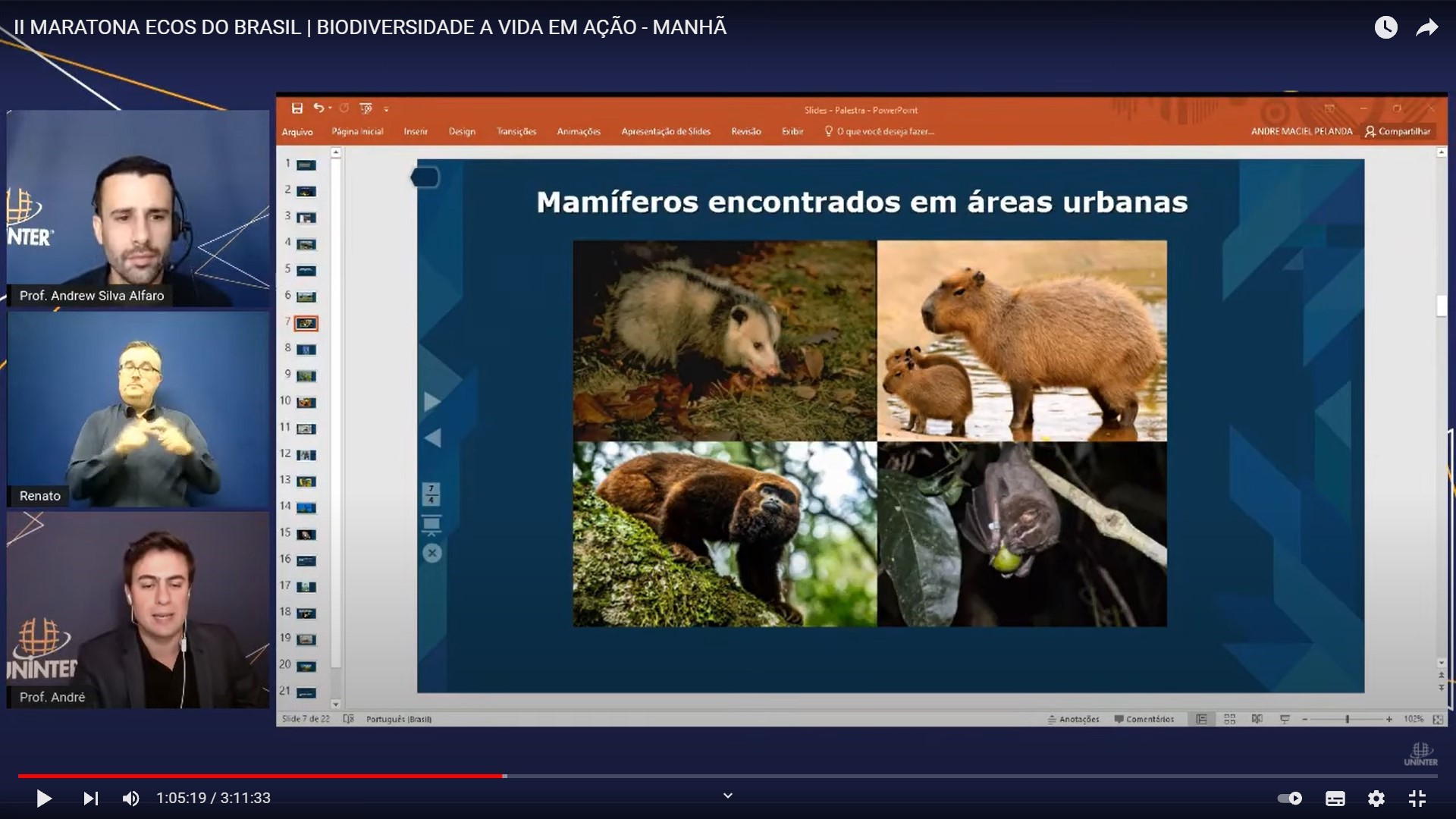 A importância da fauna nos espaços urbanos foi tema de palestra na 2ª Maratona Ecos do Brasil – Biodiversidade, a vida em ação, promovida pelo Grupo Uninter nos canais oficiais do Facebook e Youtube, no dia 24.set.2021. A live que abriu a série de debates, “A importância das espécies da fauna encontrada nos centros urbanos”, foi mediada pelo professor Andrew Alfaro e apresentada pelo professor André Maciel Pelanda.