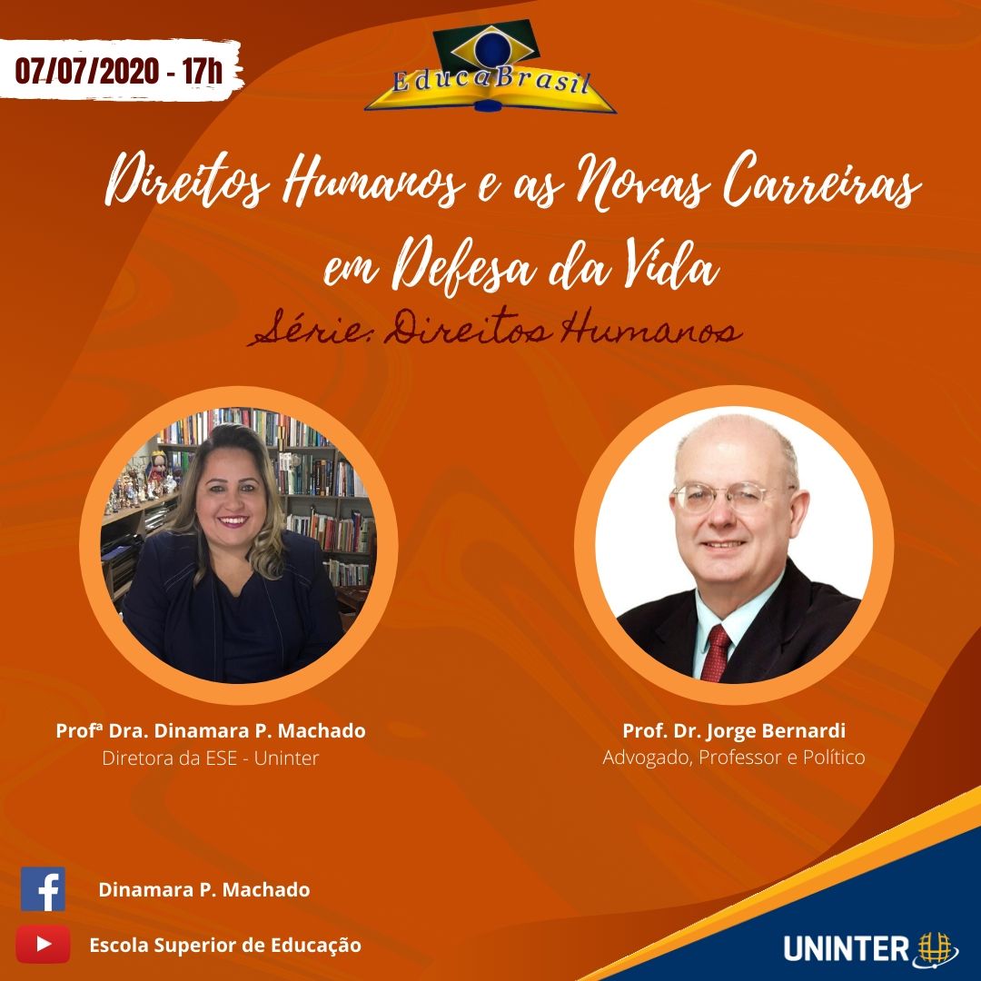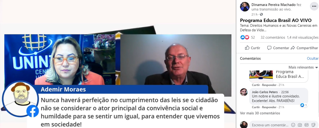 O bate-papo entre os professores aconteceu durante edição do programa Educa Brasil, que teve como tema “Direitos humanos e as novas carreiras em defesa da vida”. A transmissão aconteceu em uma live pelo Facebook e também pelo canal do Youtube da Escola Superior de Educação da Uninter. Esta foi a primeira edição de uma série sobre os direitos humanos que acontecerá nas próximas semanas. Acompanhe a página para assistir ao vivo todas, as terças-feiras às 17 horas.