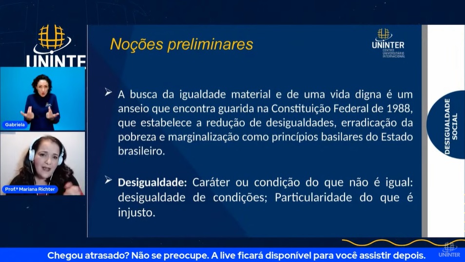 O tema foi debatido pelo Global Meeting realizado pela Uninter no dia 27 de outubro. A live foi mediada pela professora Fabiana Prestes e teve como convidadas as professoras do curso de Serviço Social da Uninter, Mariana Richter e Cleci Elisa Albiero. O intuito da palestra foi de promover o diálogo para possibilitar a inclusão na sociedade a partir de uma análise dos indicadores socioeconômicos. A palestra está disponível na íntegra neste link.