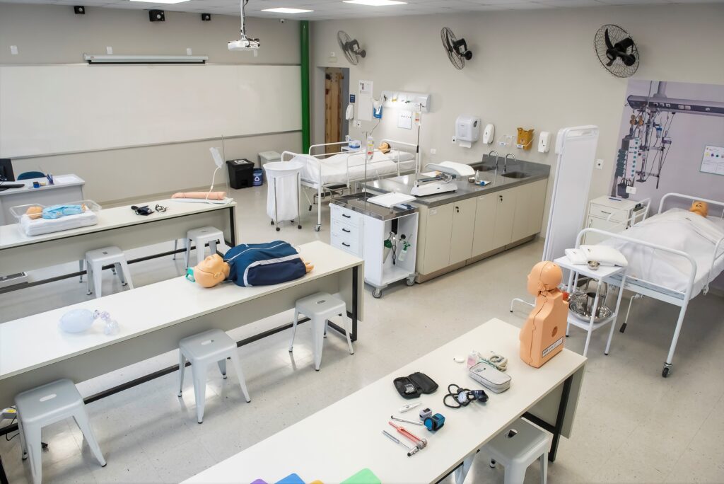 A metodologia do curso de Enfermagem da Uninter é semipresencial, com aulas presenciais, on-line e práticas em laboratórios (foto). Oferece recursos educacionais tecnológicos, material didático próprio, estrutura e laboratórios físicos para as atividades semanais. O aluno também será inserido em cenários de aprendizagem em saúde, como hospitais e clínicas.