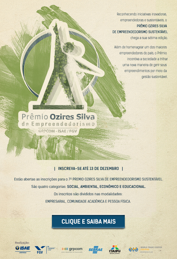 Estão abertas as inscrições para a sétima edição do Prêmio Ozires Silva de Empreendedorismo Sustentável. Podem participar estudantes de graduação e pós-graduação matriculados ou já formados, com até um ano da data de premiação, além de empresas e pessoas físicas que contribuíram para o desenvolvimento sustentável da sociedade.
