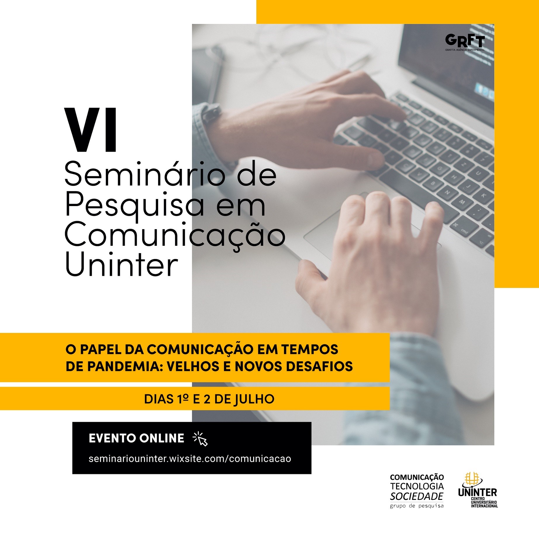 O Seminário de Pesquisa em Comunicação Uninter chega à sua sexta edição em 1º e 2.jul.21. O objetivo deste ano é promover a discussão sobre “O papel da comunicação em tempos de pandemia: velhos e novos desafios”. Com apresentações totalmente remotas, o evento reúne trabalhos acadêmicos de graduação e pós-graduação resultantes de pesquisas consolidadas, em andamento ou projetos de iniciação científica, TCCs, mestrados e doutorados, vinculados a qualquer instituição de ensino e pesquisa.