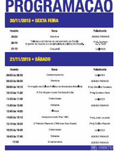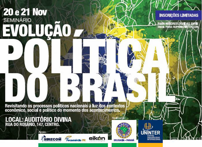 Nos dias 20 e 21 de novembro acontecerá no auditório do Campus Divina, o Seminário Evolução Política do Brasil realizado pela (ADESG Paraná) em parceria com o Centro Universitário Internacional UNINTER.
