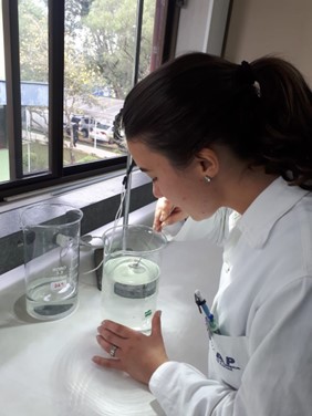 A principal atividade do laboratório é a análise dos recursos hídricos de todo o Paraná, inclusive quando ocorrem os desastres ambientais, como derramamento de produto tóxico e contaminação de cursos da água ou nascentes, por exemplo. No estágio, as estudantes Samara e Sabrina estabelecem a rotina diária de trabalho, realizando os protocolos pré-definidos para cada análise e com verificação do supervisor.