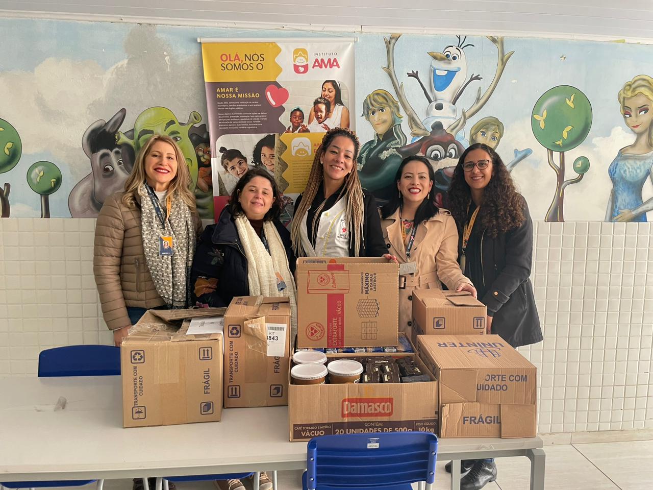 A assistente social do IBGPEX, Luiza Gomes, a coordenadora de Direito, Tiemi Saito, a coordenadora de Serviço Social, Adriane Brun, e a coordenadora do Núcleo de Prática Jurídica, Sabrina Alberto, fizeram a entrega dos alimentos na organização social no dia 19 de junho.