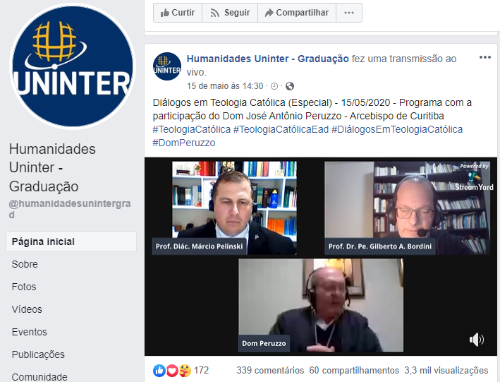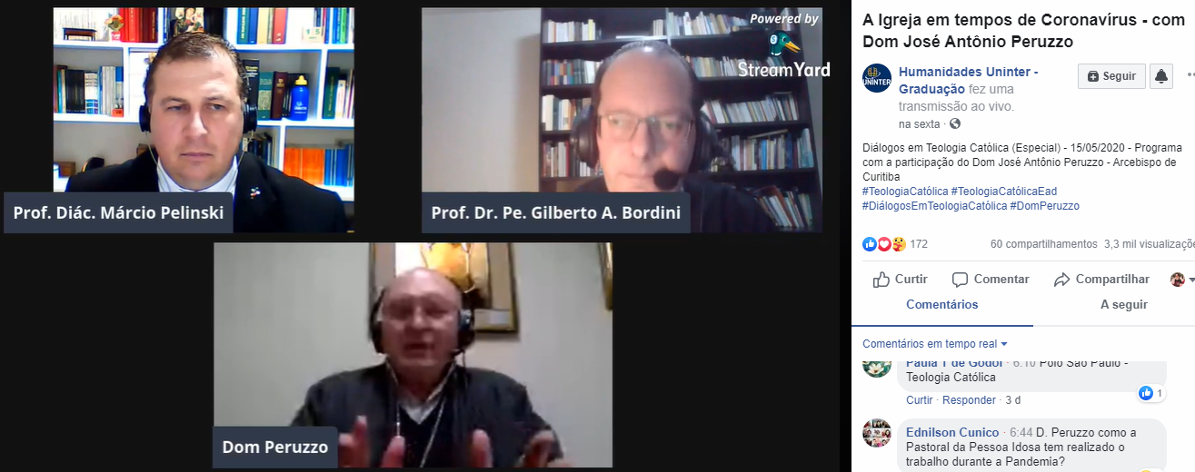 Na última sexta-feira, 15.05.2020, uma live transmitida pela página do Facebook dos cursos de Humanidades da Uninter reuniu o diácono Márcio Pelinski, o padre Gilberto Bordini e o arcebispo de Curitiba, Dom Peruzzo. Os três ministram disciplinas no curso de Teologia Católica da instituição e o encontro virtual se deu para o debate em torno do tema A Igreja em tempos de coronavírus.