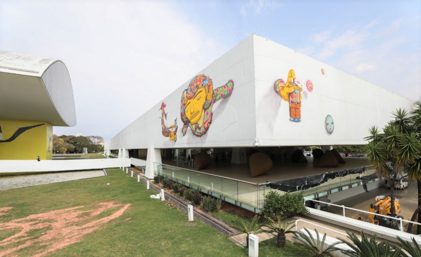 Um recente grafite dos artistas intitulados “Gêmeos” (Otávio e Augusto Pandolfo) na fachada do museu Oscar Niemeyer (foto), em Curitiba, teve o objetivo de promover uma exposição deles que ocorre no local. Porém, a pintura desagradou o bisneto de um dos arquitetos brasileiros mais conhecidos entre nós e que projetou o museu.
