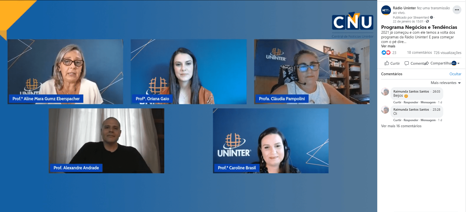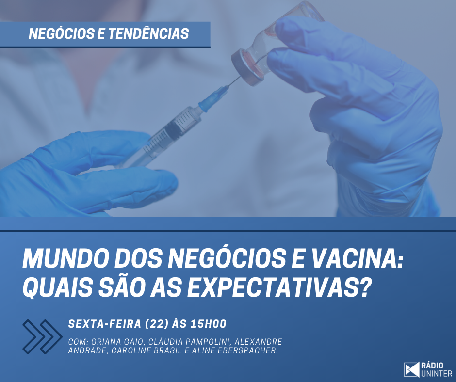 Na primeira edição do programa programa Negócios e Tendências deste ano, transmitida ao vivo pela Rádio Uninter, no dia 22.fev.2021, pelo Facebook e Youtube, professores da pós-graduação da área de negócios conversaram sobre o tema “O mundo dos negócios e a vacina: quais são as expectativas”. O bate-papo contou com os professores Alexandre Francisco de Andrade, Aline Eberspacher, Caroline Brasil, Cláudia Pampolini e Oriana Gaio, coordenadores de cursos de pós-graduação da área de negócios da Uninter.