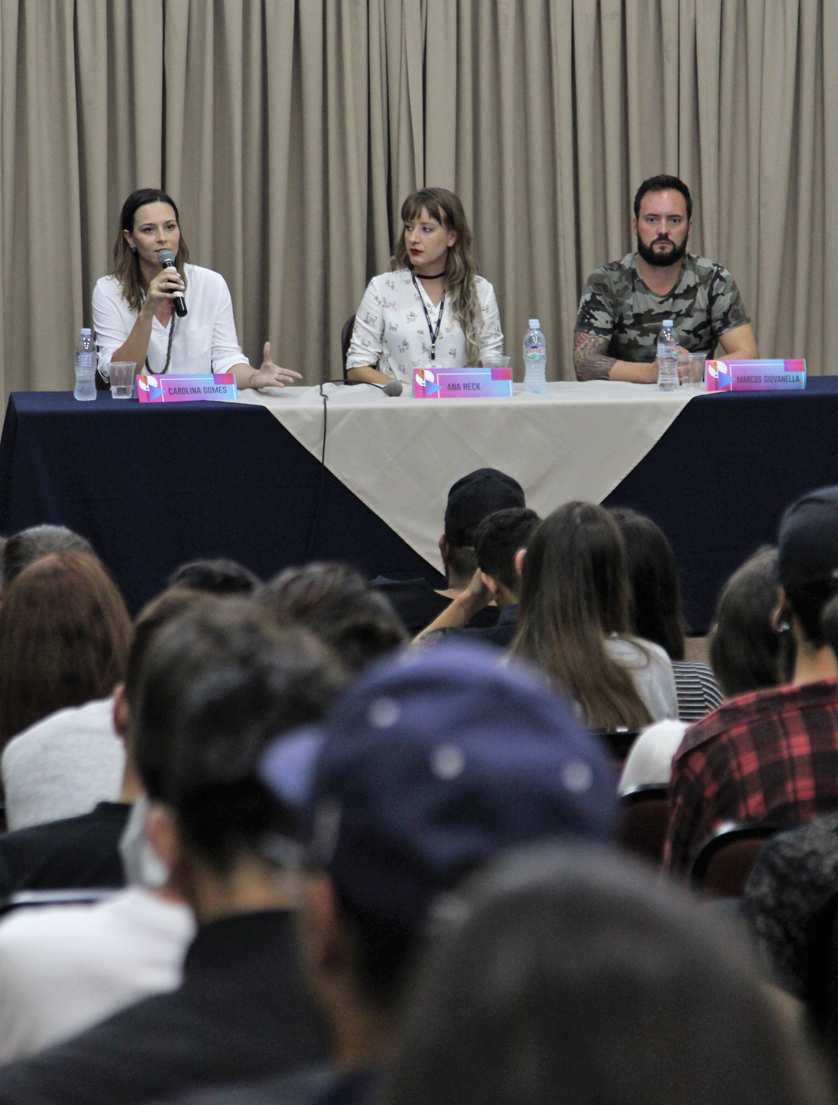 A diretora de Jornalismo da Rádio Band News Curitiba, Carolina Gomes, e o sócio-proprietário da agência de publicidade Queen Content, Marcos Giovanella, dividiram com os estudantes um pouco sobre sua trajetória profissional e sobre o atual mercado de trabalho de cada uma das carreiras. A conversa foi mediada pela professora de PP da Uninter Ana Heck.